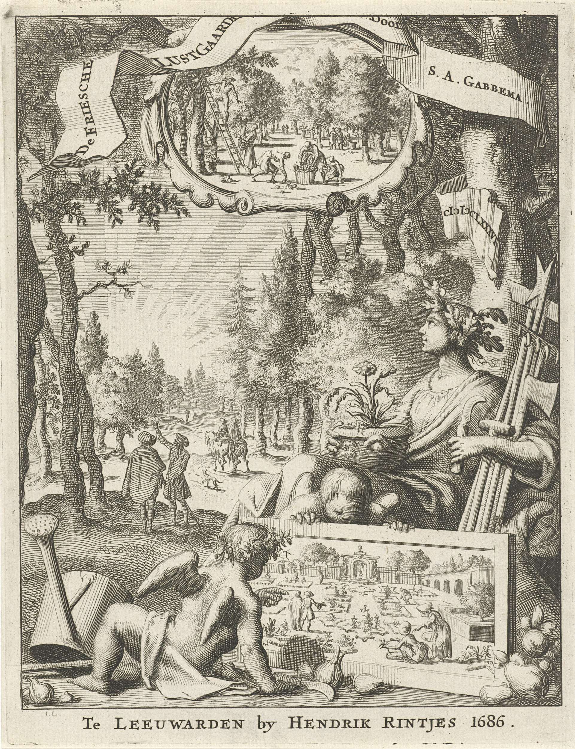 Een vrouw zit met tuingereedschap en een bloempot op schoot onder een boom. Haar hoofd is versierd met een krans van eikenblad. Op de voorgrond bestuderen putti een afbeelding van een rijk aangelegde tuin. In de verte ruiters en wandelaars in de natuur. Geheel bovenin een cartouche met de beeltenis van figuren die vruchten oogsten.