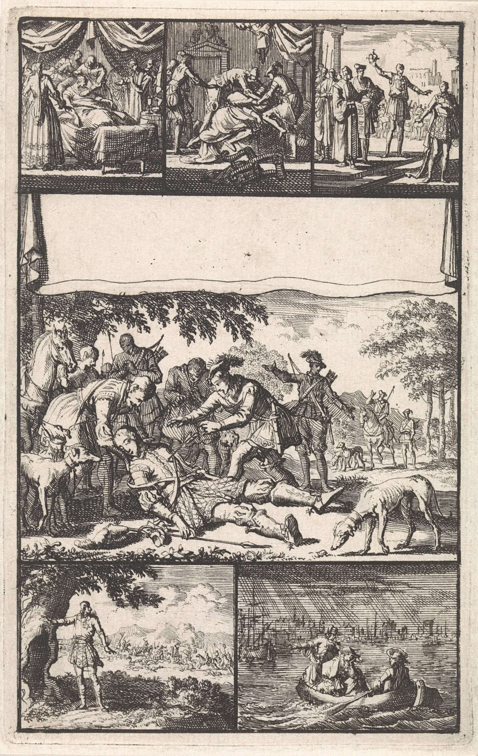 Willem II, koning van Engeland, door de ridder Walter Tyrrell tijdens de jacht dodelijk getroffen door een pijl. Boven en onder deze centrale voorstelling staan verschillende scènes uit de Engelse koninklijke geschiedenis. Van links naar rechts en van boven naar beneden: Hendrik II op zijn sterfbed; Richard II in de gevangenis vermoord; Eduard II van ...