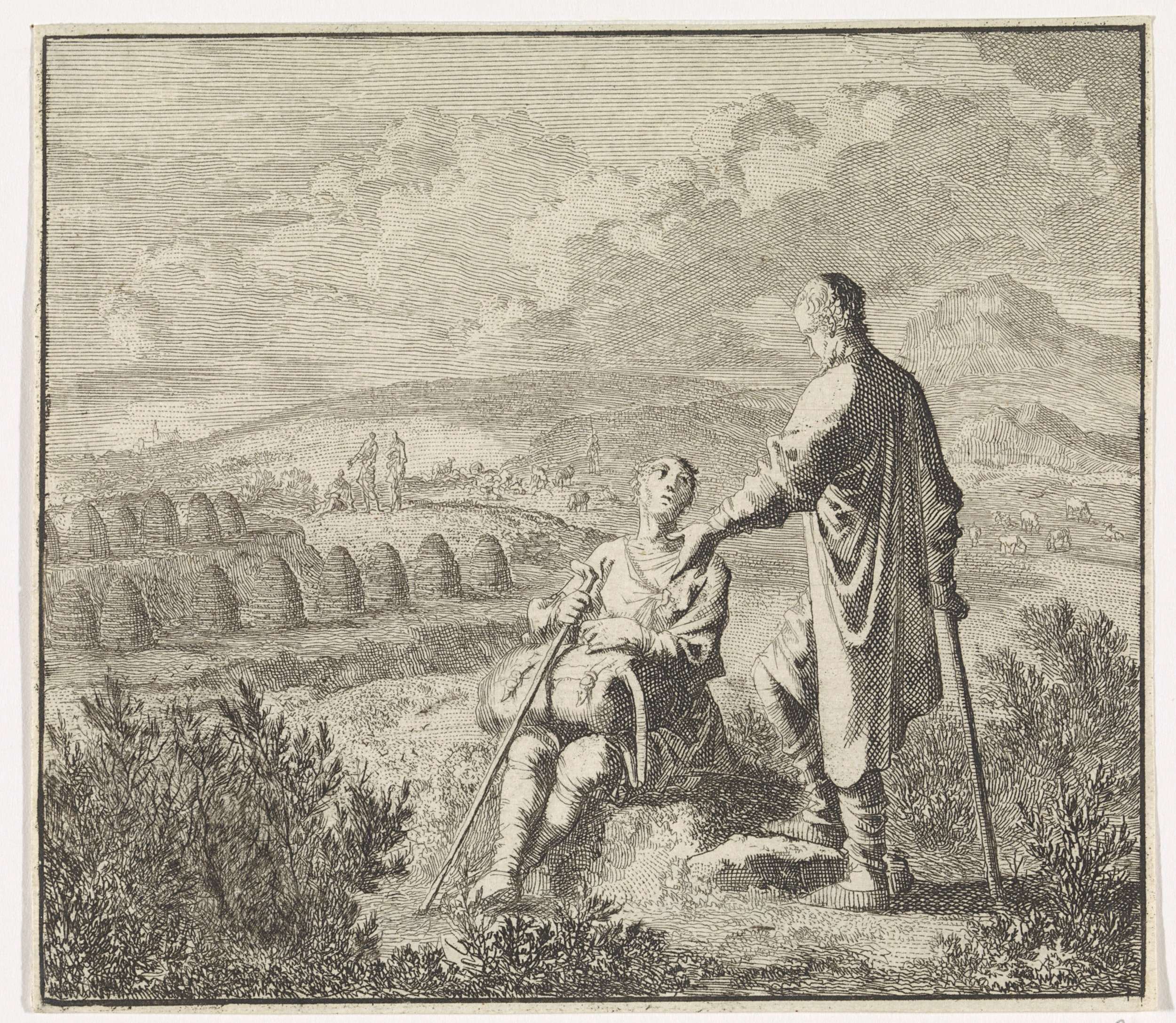 Een landschap met velden en op de achtergrond verschillende bijenkorven. Op de voorgrond een staande en een zittende man in conversatie.
