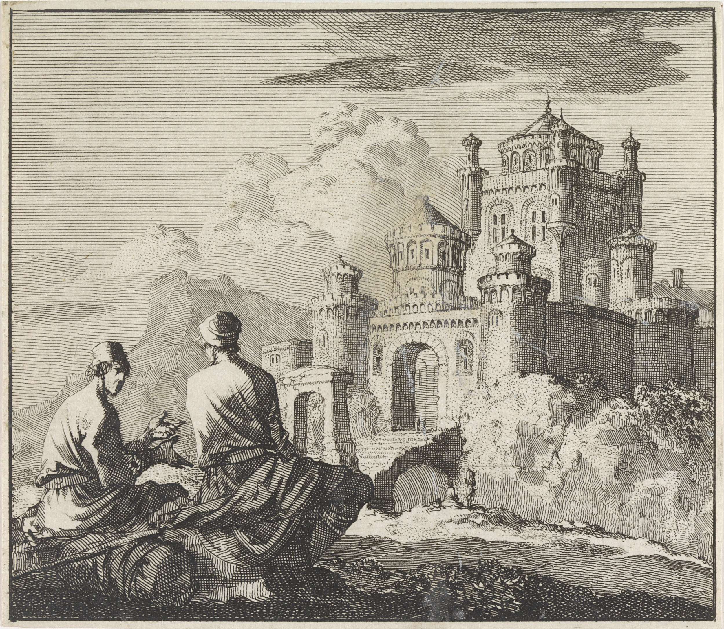 Een landschap met een burcht. Op de voorgrond rusten twee reizigers.