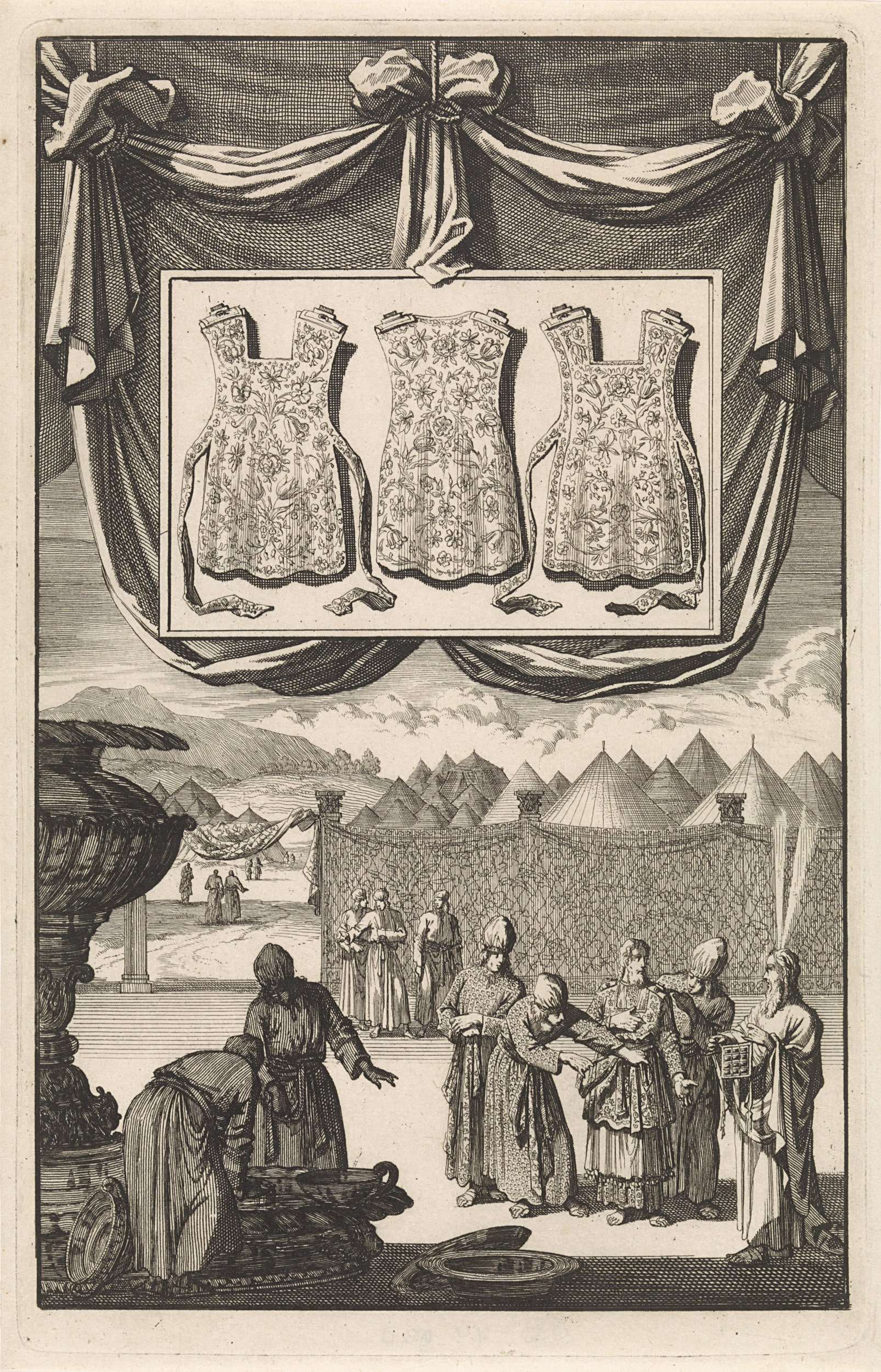 Op de voorgrond Aäron in het Joodse priestergewaad met borstschild (hoshen). Rechts Mozes met in de handen de borsttas met de orakelstenen Urim en Tummim. Boven in een aparte lijst de onderdelen van het borstschild.