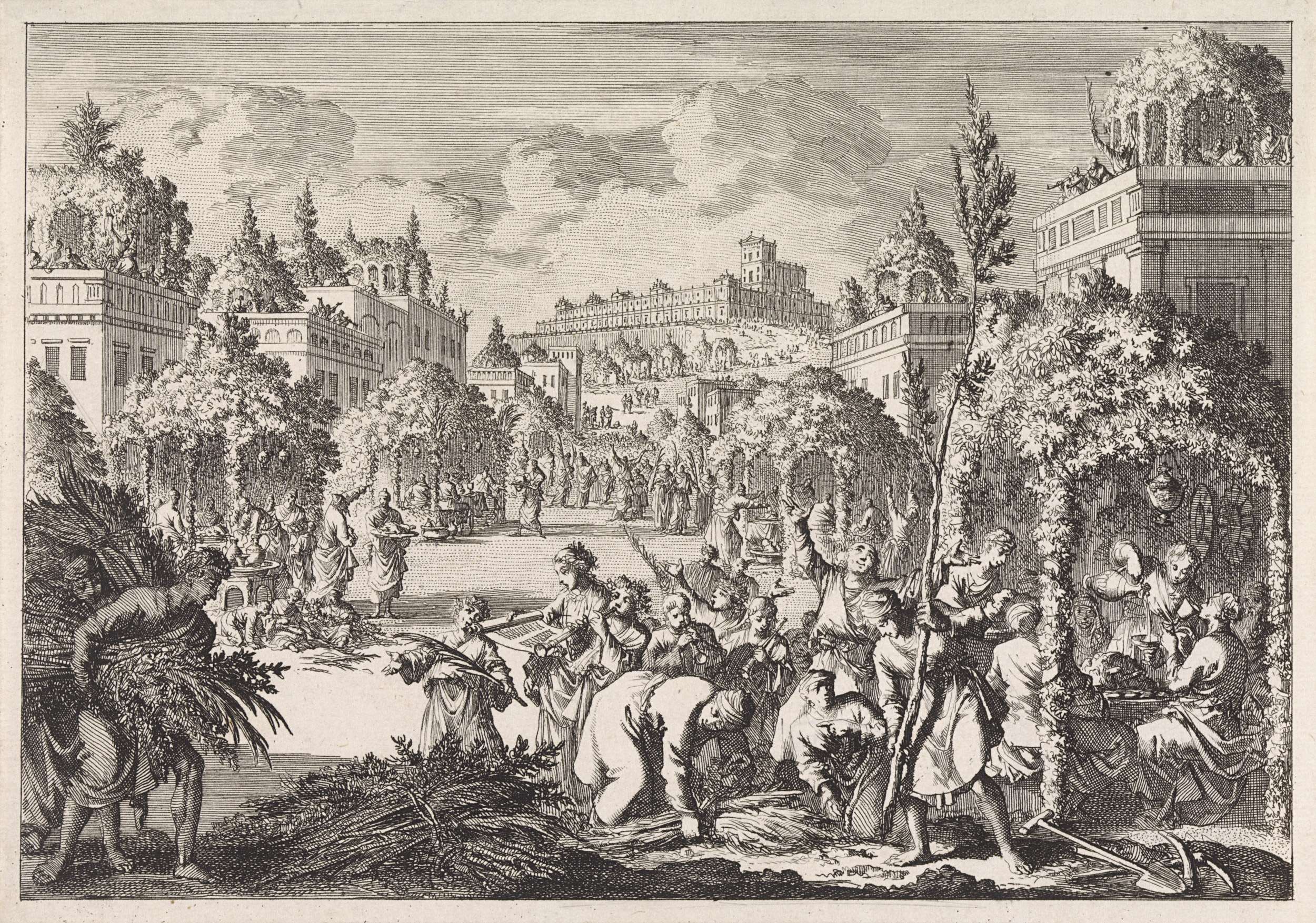 Het Joodse volk viert het loofhuttenfeest na de inwijding van de tempel. In de straten van Jeruzalem worden loofhutten gebouwd. Op de voorgrond brengt men loofhout aan en wordt er gedronken en muziek gespeeld.
