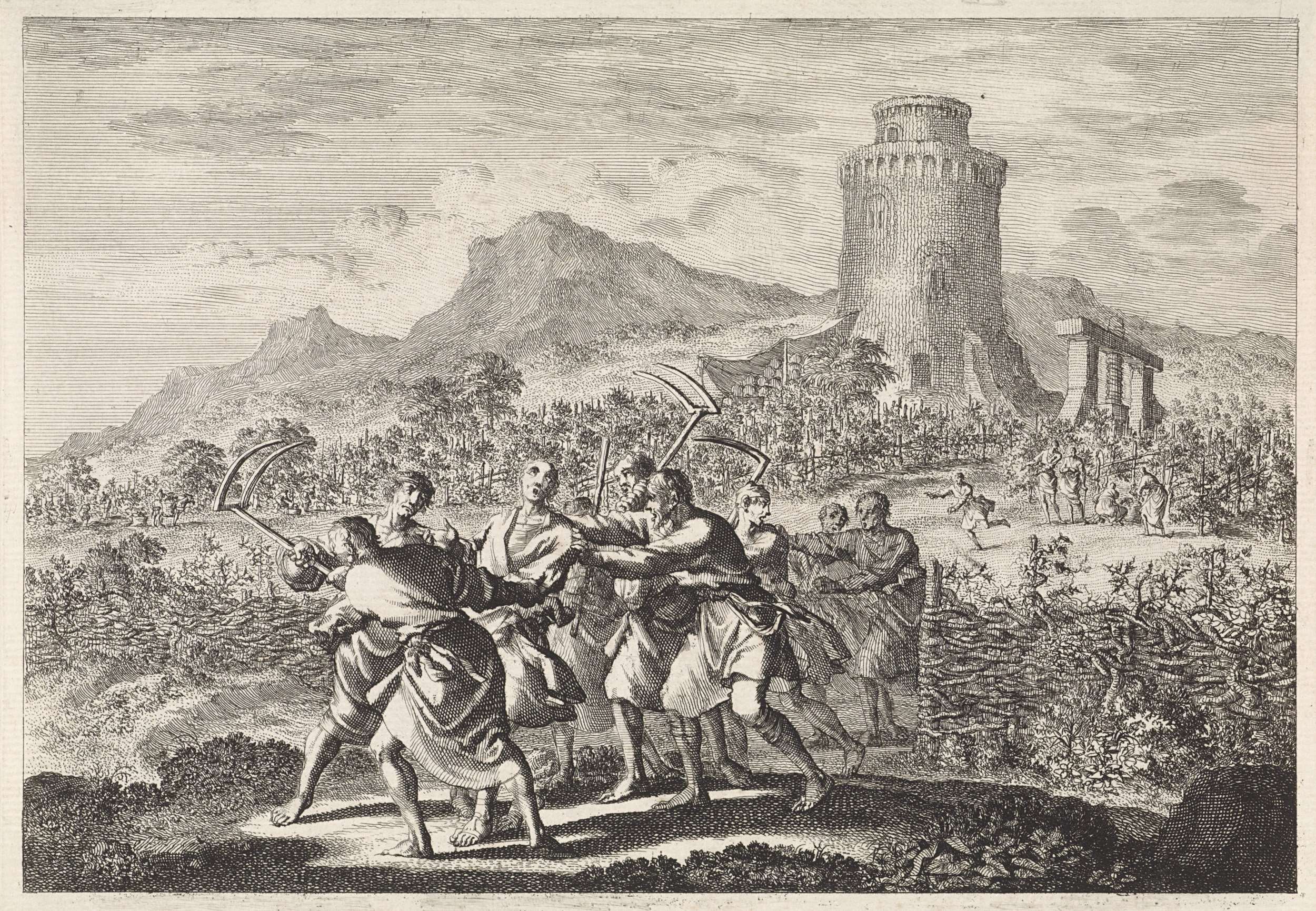 Een voorstelling van de gelijkenis van de pachters van de wijngaard. Op de voorgrond wordt de zoon van de eigenaar van een wijngaard vermoord door de pachters. Op de achtergrond de wijngaard, waar een van de knechten van de eigenaar voor de pachters vlucht.