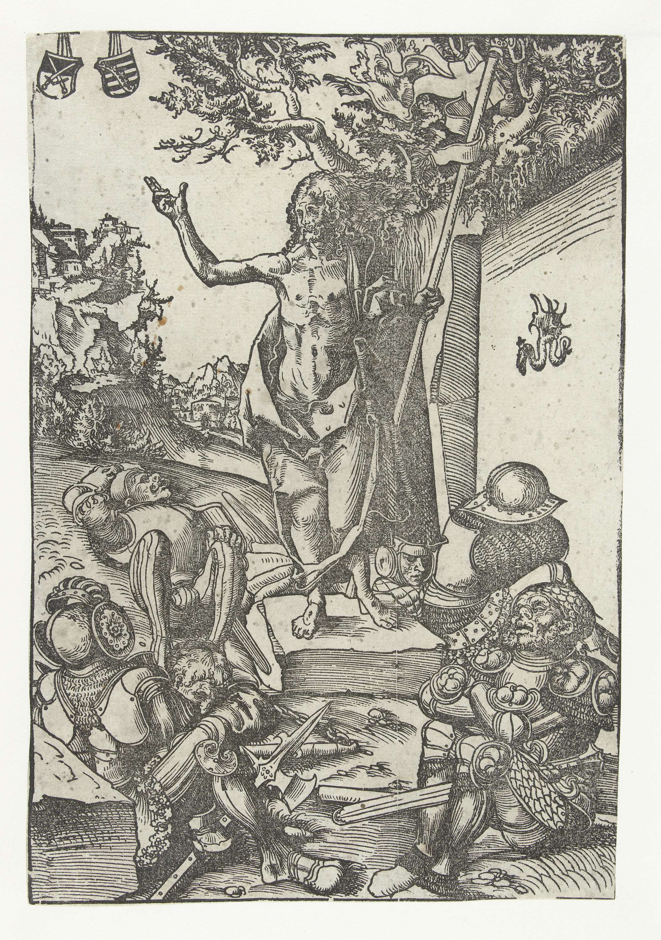 Christus is opgestaan uit zijn graf en staat op een steen met een kruisvaandel in zijn hand. De soldaten die het graf bewaken zitten en liggen slapend aan zijn voeten. Linksboven zijn twee schilden weergegeven met het keurvorstelijk en hertogelijk wapen van Saksen