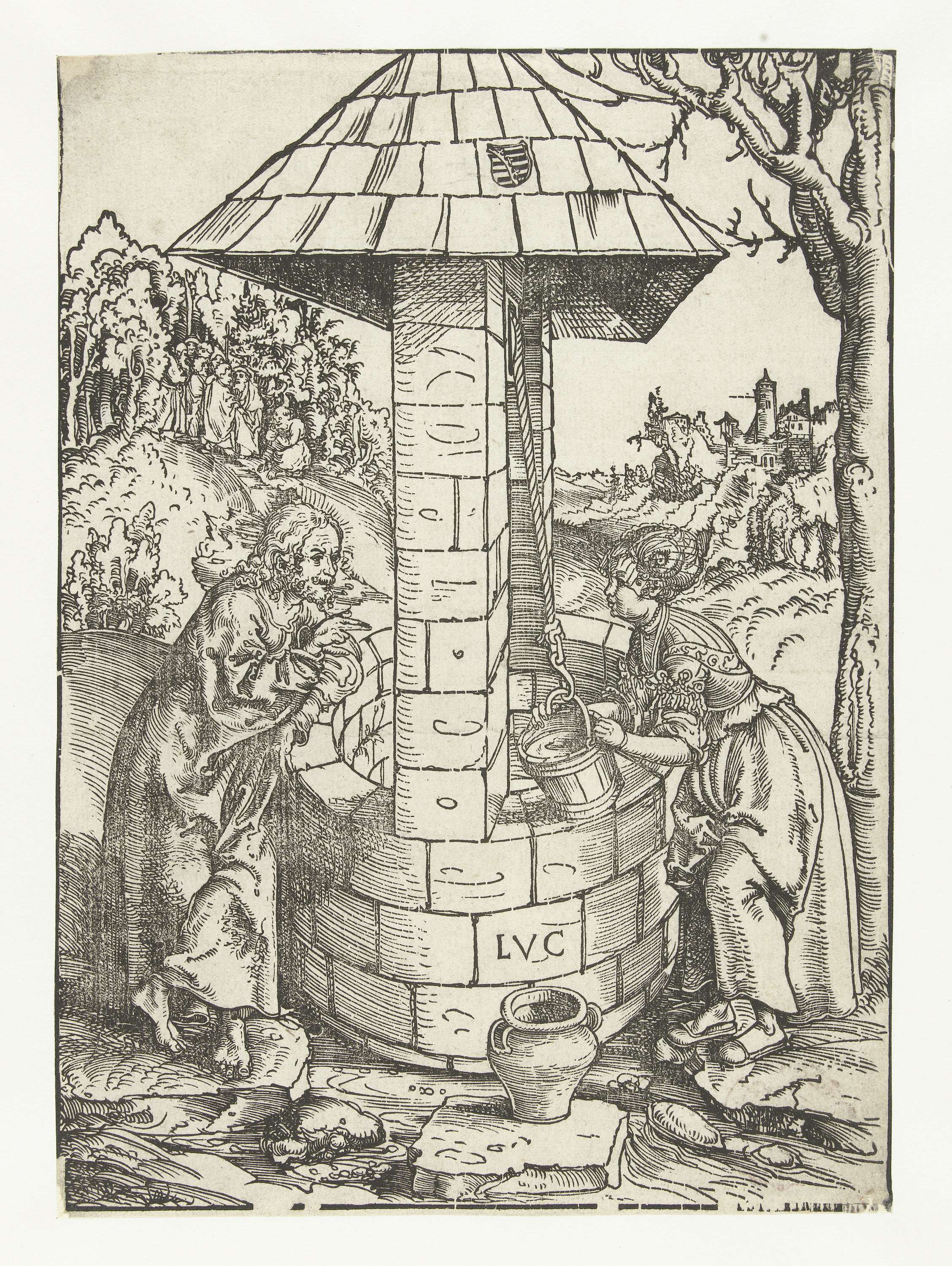 Een vrouw put water bij de bron van Jakob. Christus vraagt haar of hij wat mag drinken. Zijn discipelen die samen met hem reizen lopen in de verte op een pad. Op het dak boven de put is het hertogelijk wapen van Saksen weergegeven.