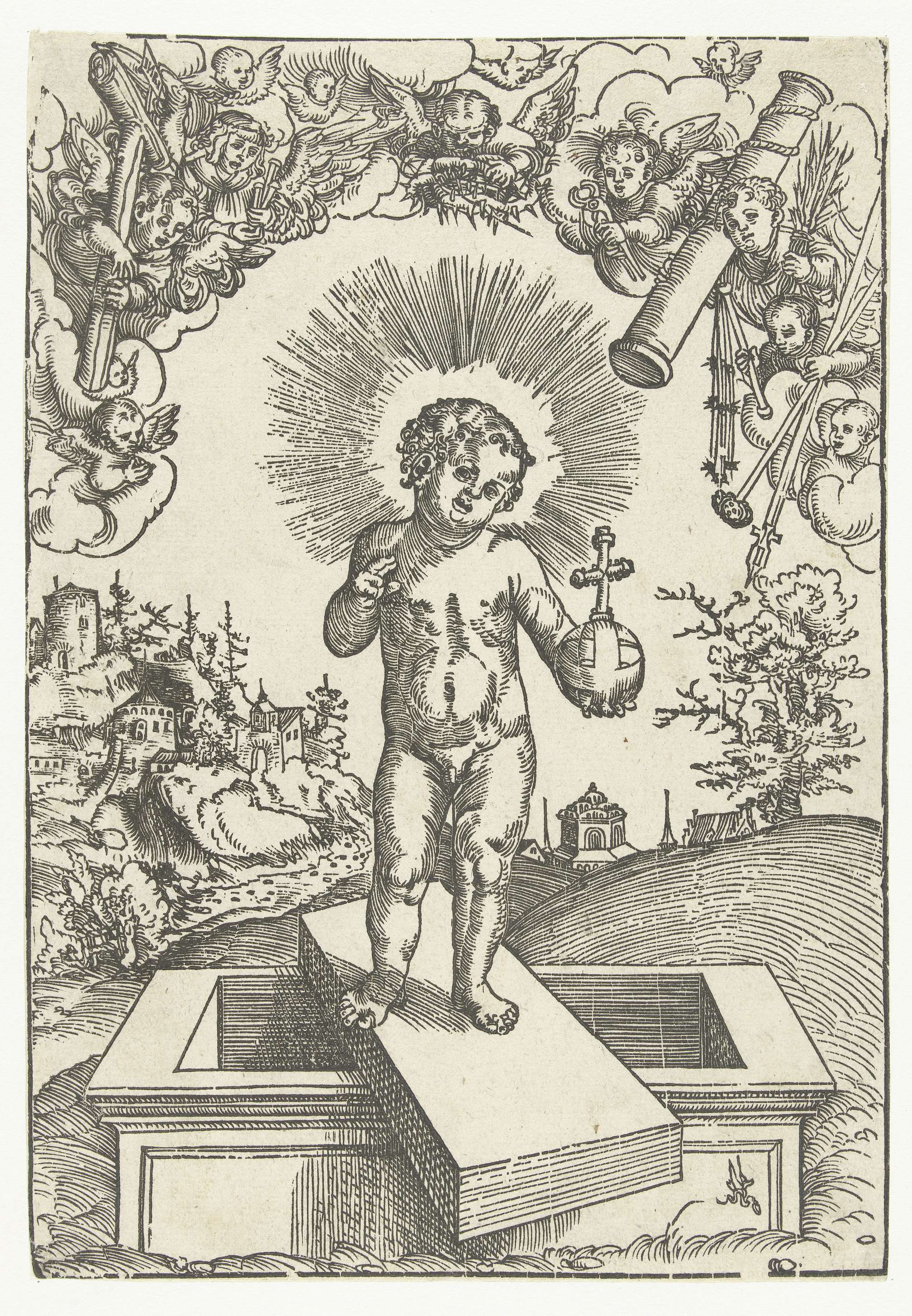 Christuskind als verlosser omringd door engelen met werktuigen van de passie