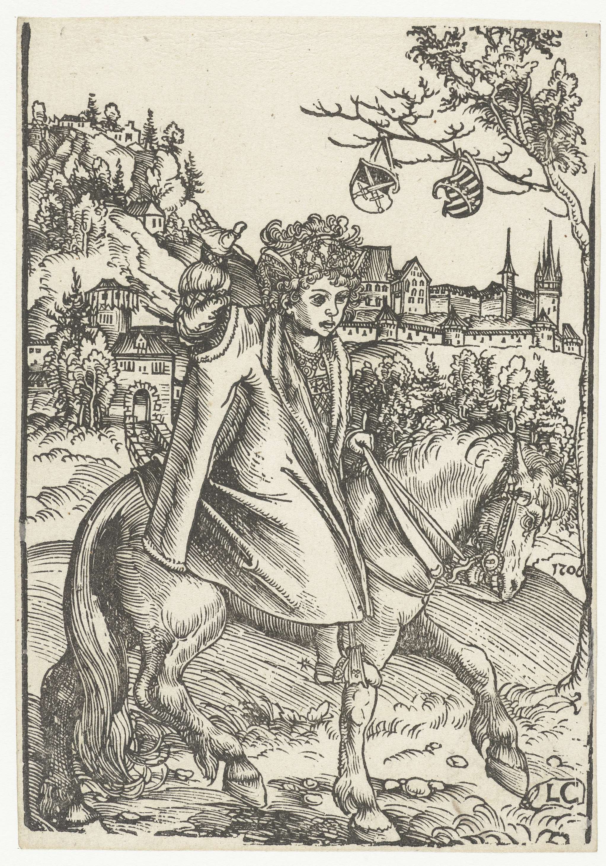 Een jongen rijdt op een paard naar rechts in een landschap. Met zijn linkerhand houdt hij het leidsel vast, zijn rechterarm heeft hij opgeheven. Hij is rijk gekleed in een mantel en een hoofddeksel met veren. Mogelijk is de jongen een Saksische prins. Op de achtergrond ligt een stad met stadsmuren en een stadspoort. Rechts ...