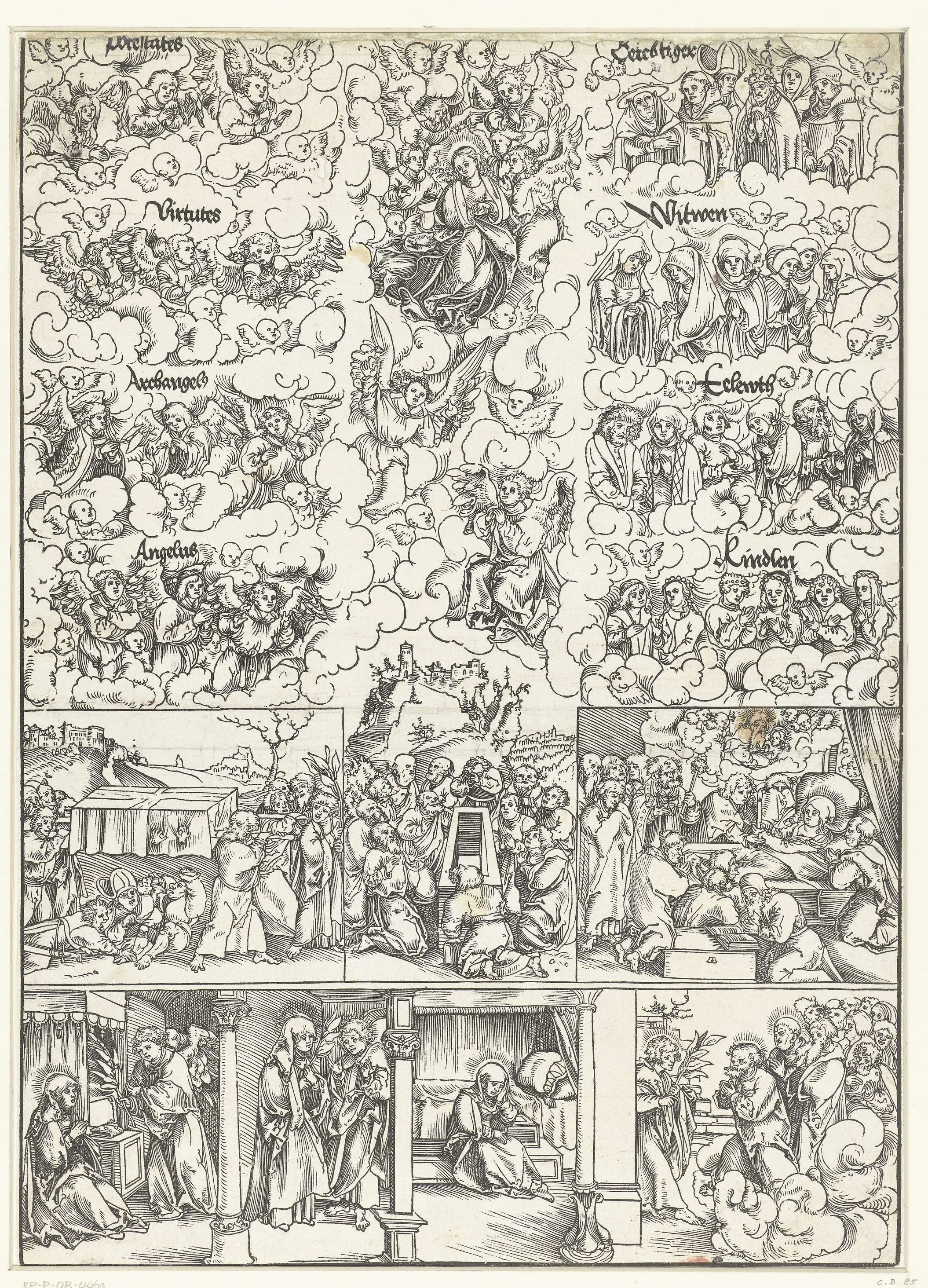 Dood van Maria met cyclus van scènes en de Hemelvaart. Onderaan het blad zijn in twee rijen boven elkaar, van links naar rechts, de volgende episoden weergegeven: Lichaam van Maria wordt naar de graftombe gedragen; Apostelen knielen bij de lege graftombe; Dood van Maria; onderste rij: Maria ontvangt de boodschap over haar dood; Maria krijgt ...