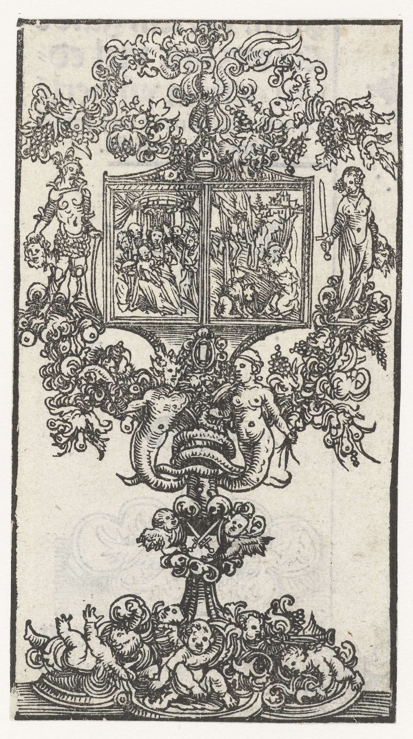 Monstrans met Maria met kind en Hieronymus als boeteling met links David met het hoofd van Goliath en rechts Judith met het hoofd van Holofernes