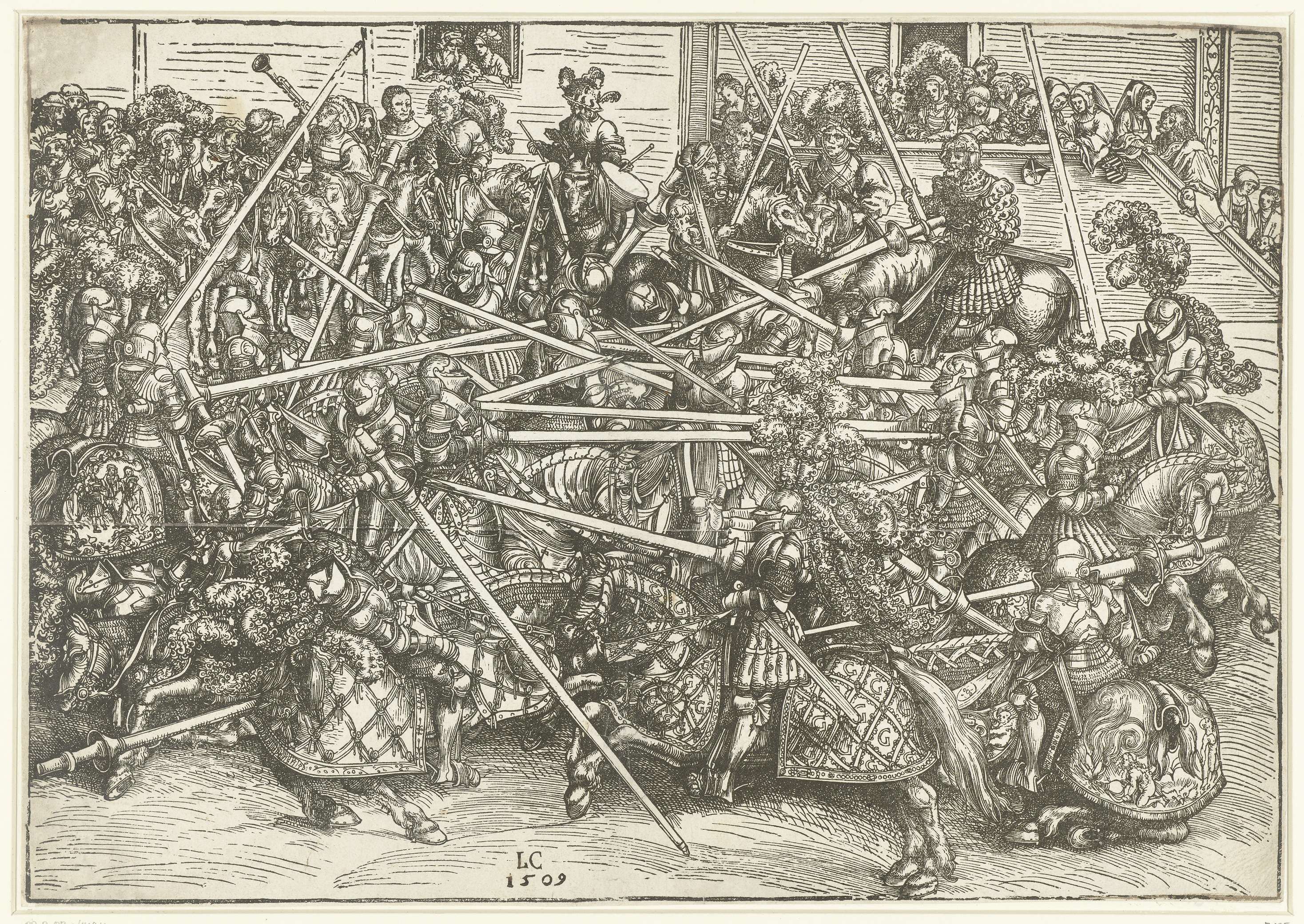 Toernooi in Wittenberg georganiseerd door het hof van Saksen. Ridders te paard rijden op elkaar in terwijl ze met lansen proberen hun tegenstander uit het zadel te werken. Linksachter staat een groep muzikanten, gezeten op paarden, te blazen op trompetten en te slaan op trommels. Op een balkon staat de adel als toeschouwer. Twee schilden ...