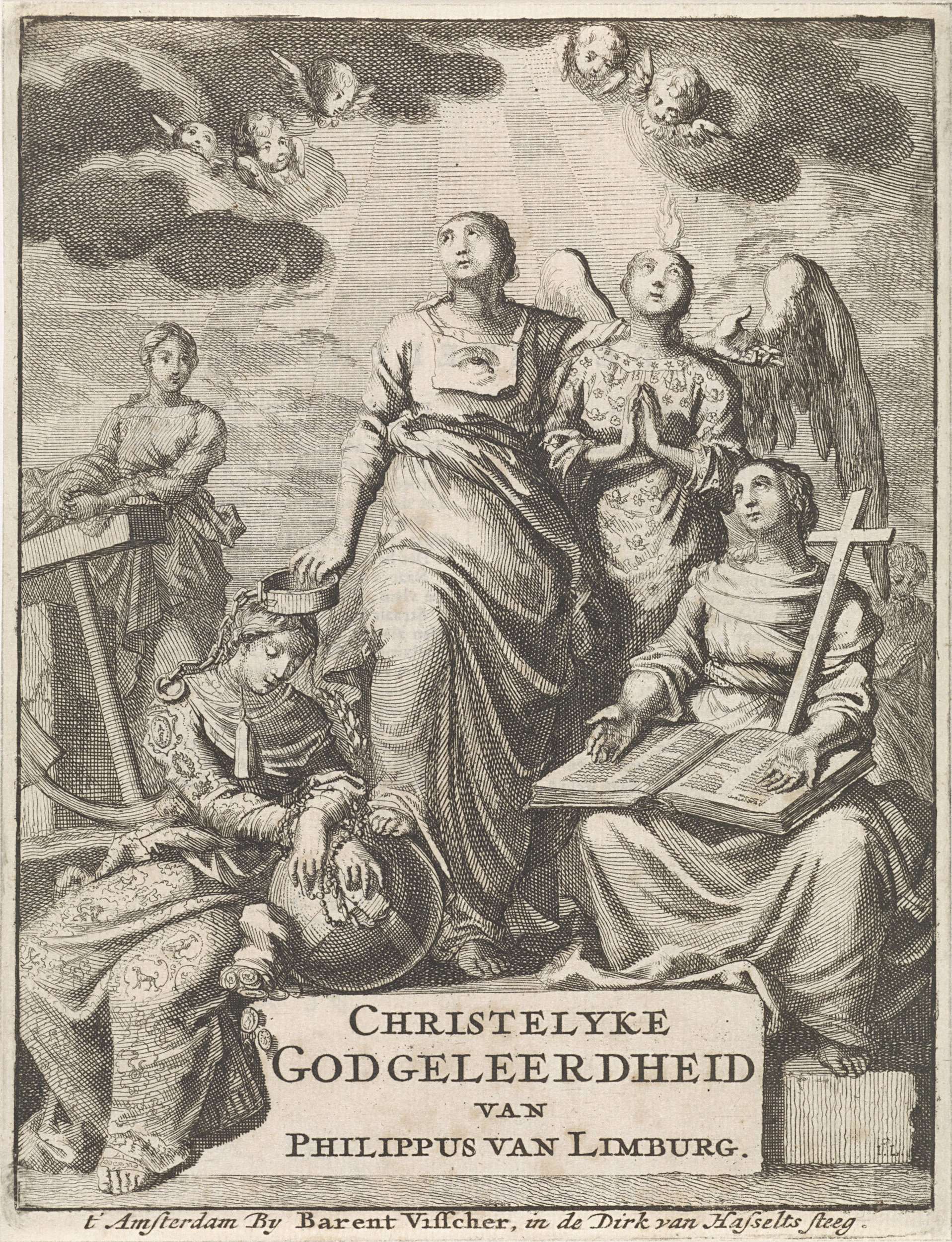 De personificatie Godsdienstigheid in omarming met Goddelijke Liefde. Beide kijken omhoog naar de hemel. Links en rechts de personificaties Hoop en Geloof. Godsdienstigheid vetrapt een wereldbol en houdt een keten als kroon boven het hoofd van de personificatie Wereldsheid. Onder de prent de titel van het boekwerk. Op het verso een Nederlands gedicht met uitleg.