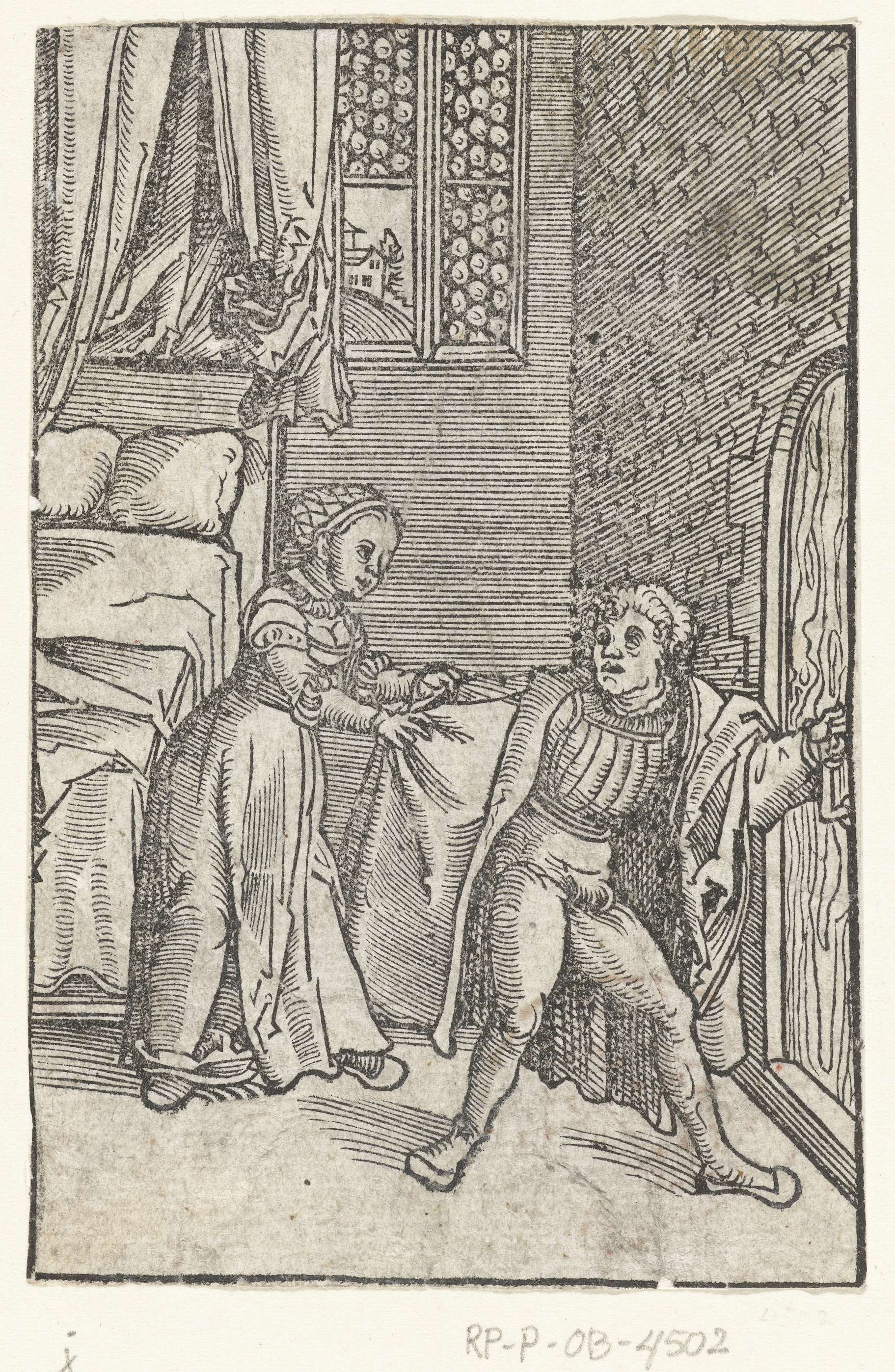 De vrouw van Potifar trekt Jozef aan zijn kleding als hij weg vlucht. Dit bijbelverhaal verwijst naar het gebod Gij zult niet dat van uw naaste begeren. Tiende en laatste prent uit een serie van tien prenten.