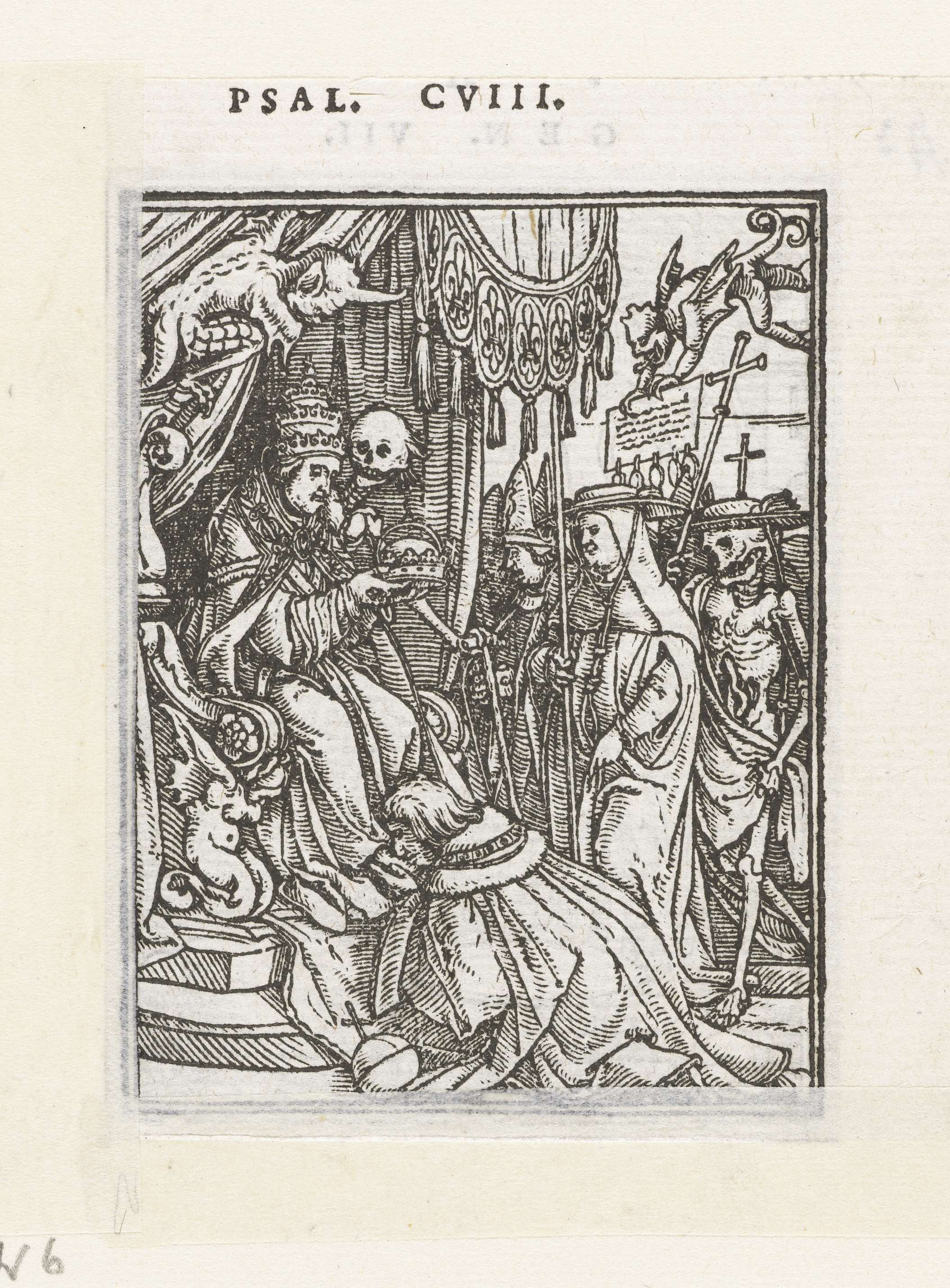 De paus zit links op zijn troon en kroont de keizer die voor hem knielt en zijn voet kust. Direct naast de troon staat de Dood. Ook tussen de geestelijken die getuigen zijn van de kroning staat rechts de Dood. In de marge boven de prent staat de tekst Psal. CVIII.