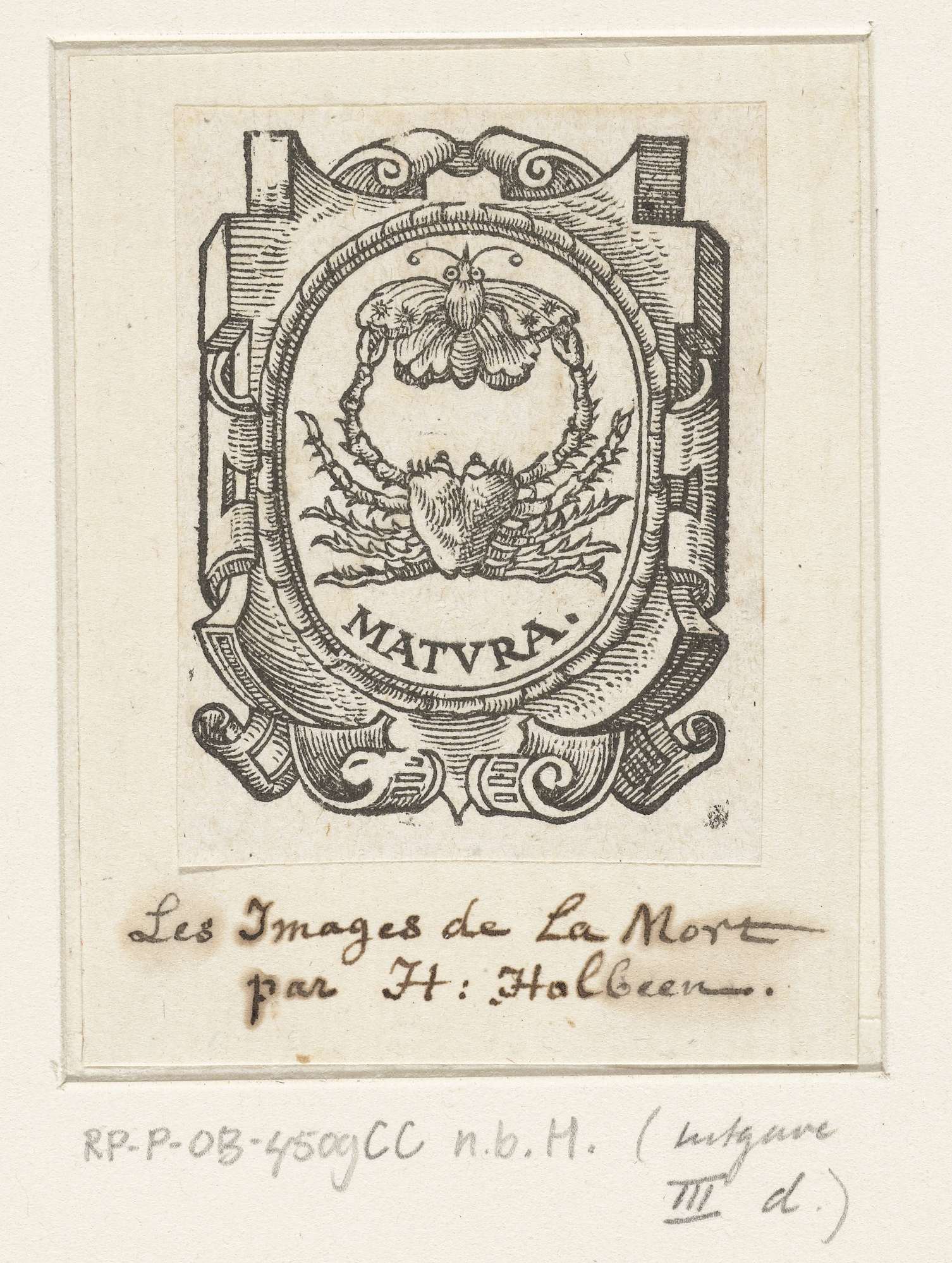 Embleem met krab en vlinder in ovale cartouche met rolwerk