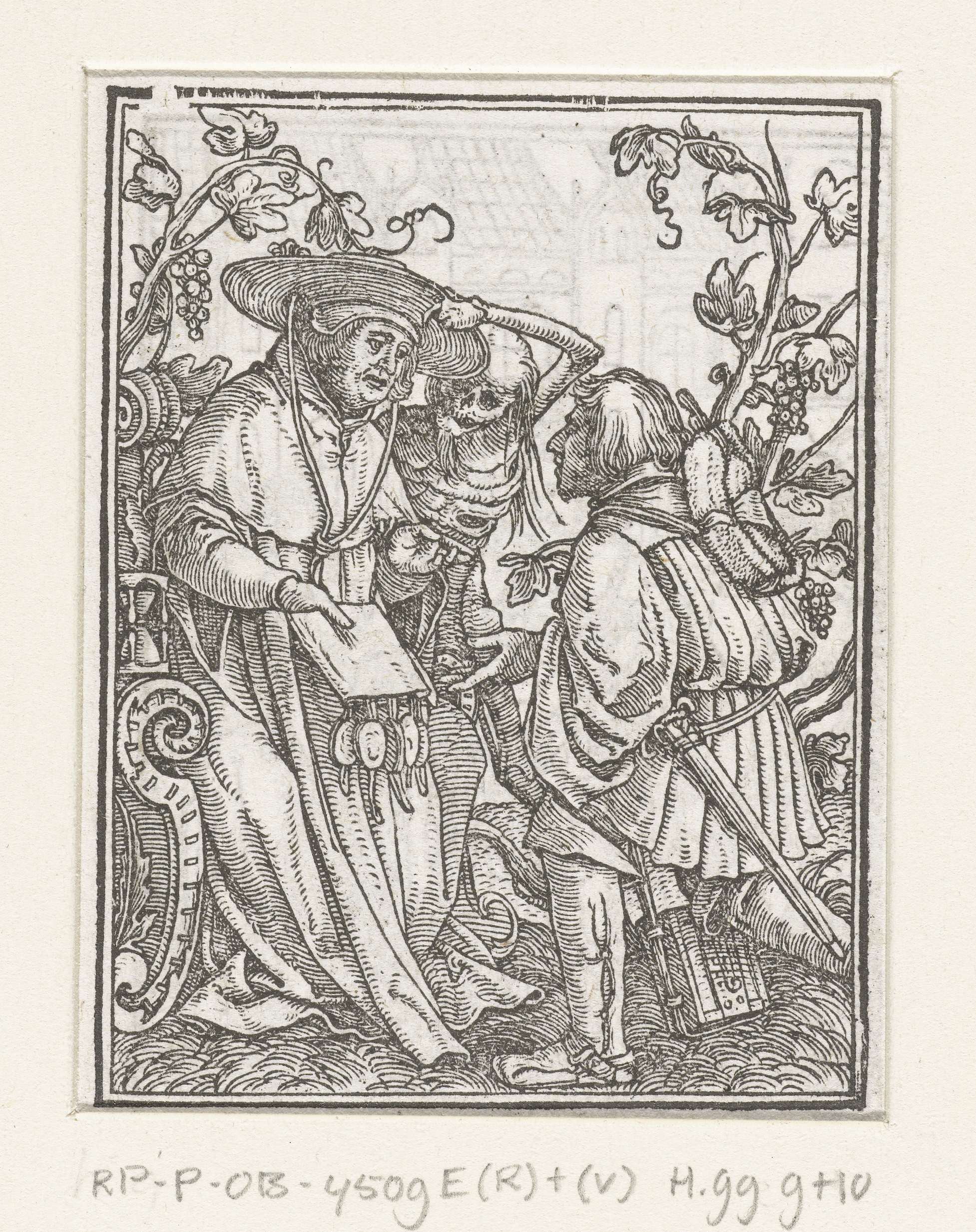 Kardinaal zittend met documenten in zijn hand, mogelijk aflaten, die hij geeft aan een knielende man voor hem. De Dood staat naast de kardinaal en heeft zijn kardinaalshoed vastgegrepen. Links op de leuning van de stoel of troon staat een zandloper en op de achtergrond groeien druivenranken. In de marge boven de prent staat de ...