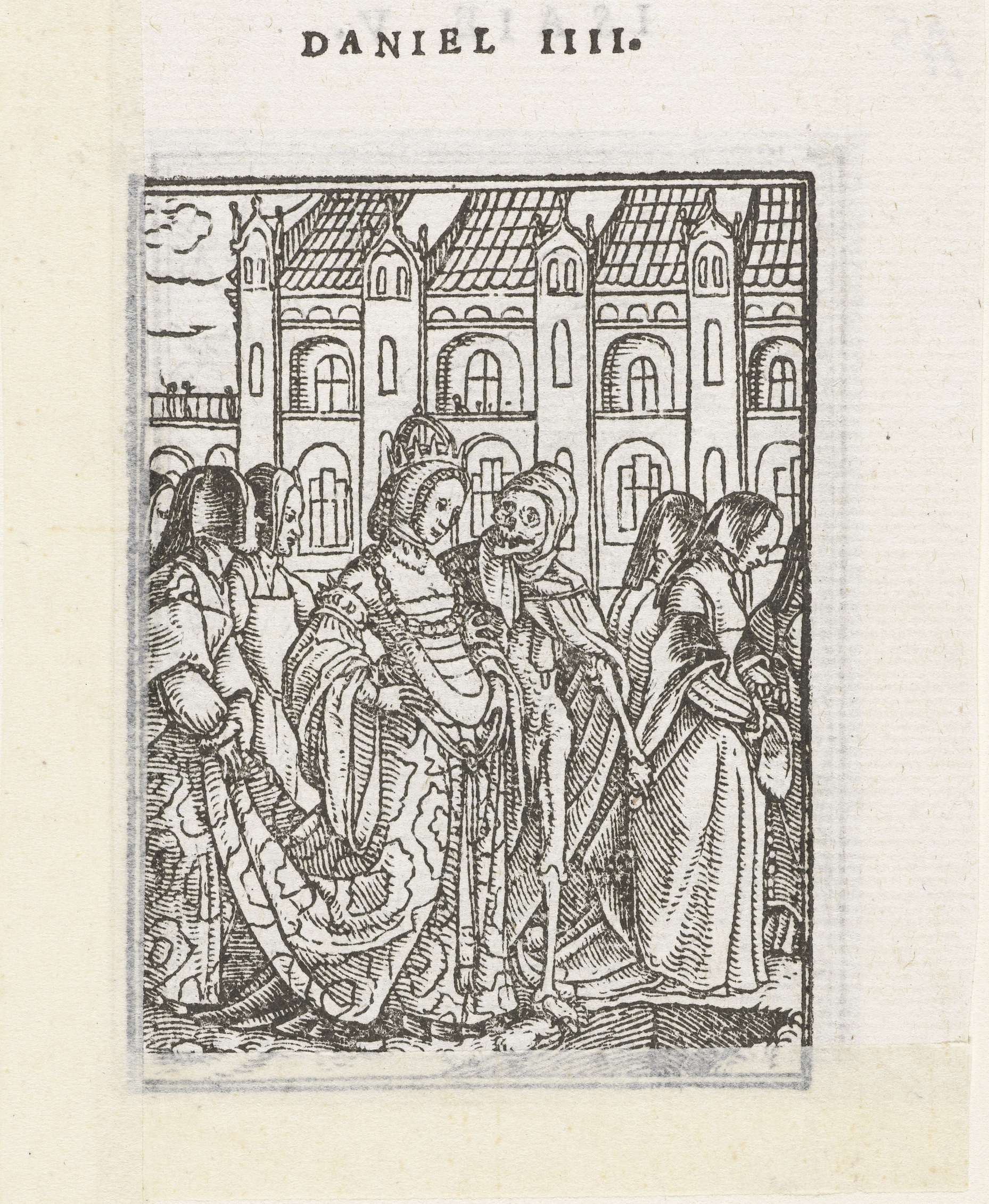 De keizerin staat samen met de Dood aan de rand van een graf, de Dood wijst naar het graf. Hofdames vergezellen de keizerin. In de marge boven de prent staat de tekst Daniel IIII.