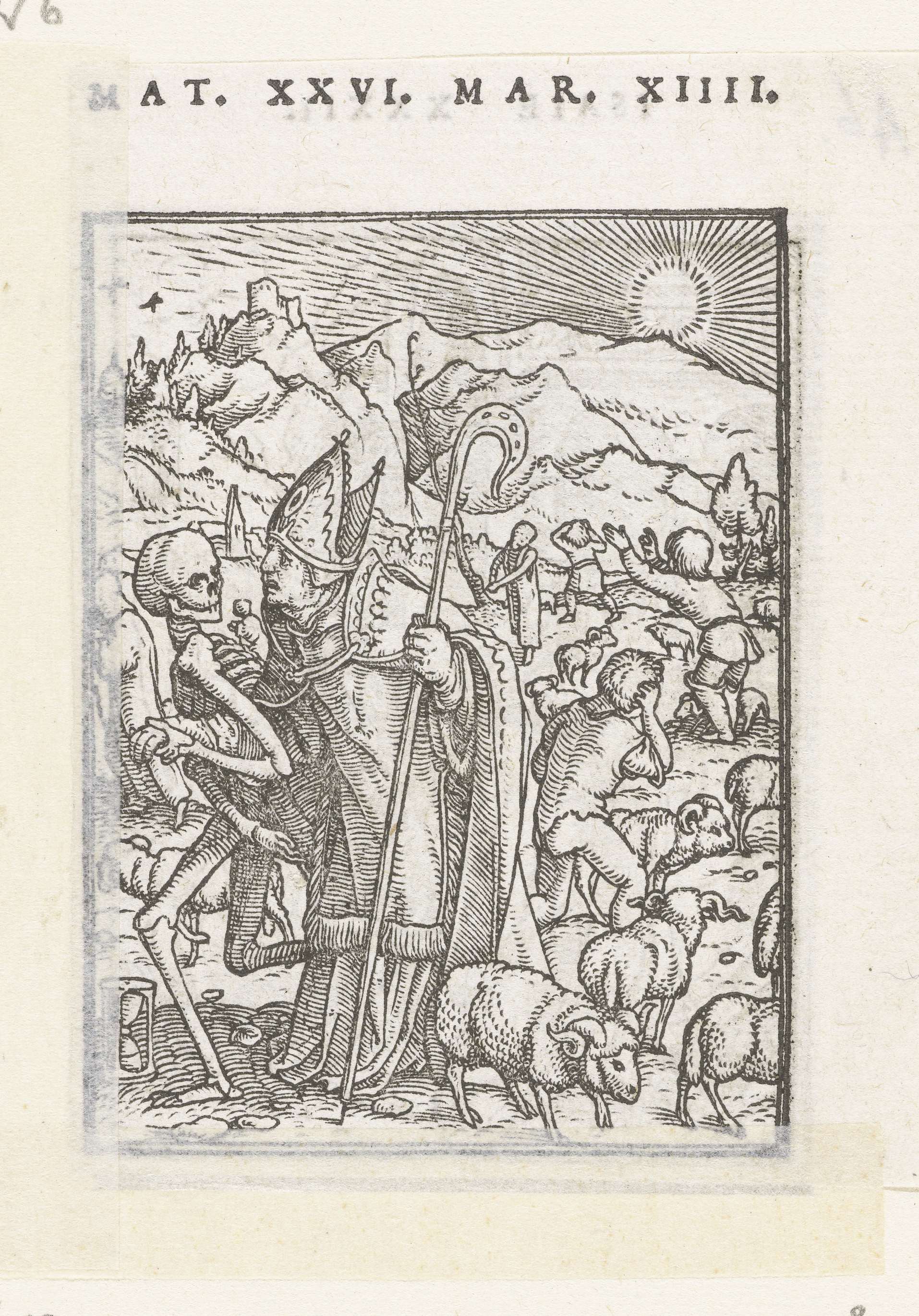 De bisschop wordt door de dood bij de arm genomen terwijl zij lopen tussen een schaapskudde en herders in een landschap. In de marge boven de prent staat de teskt Mat. XXVI. Mar. XIIII.