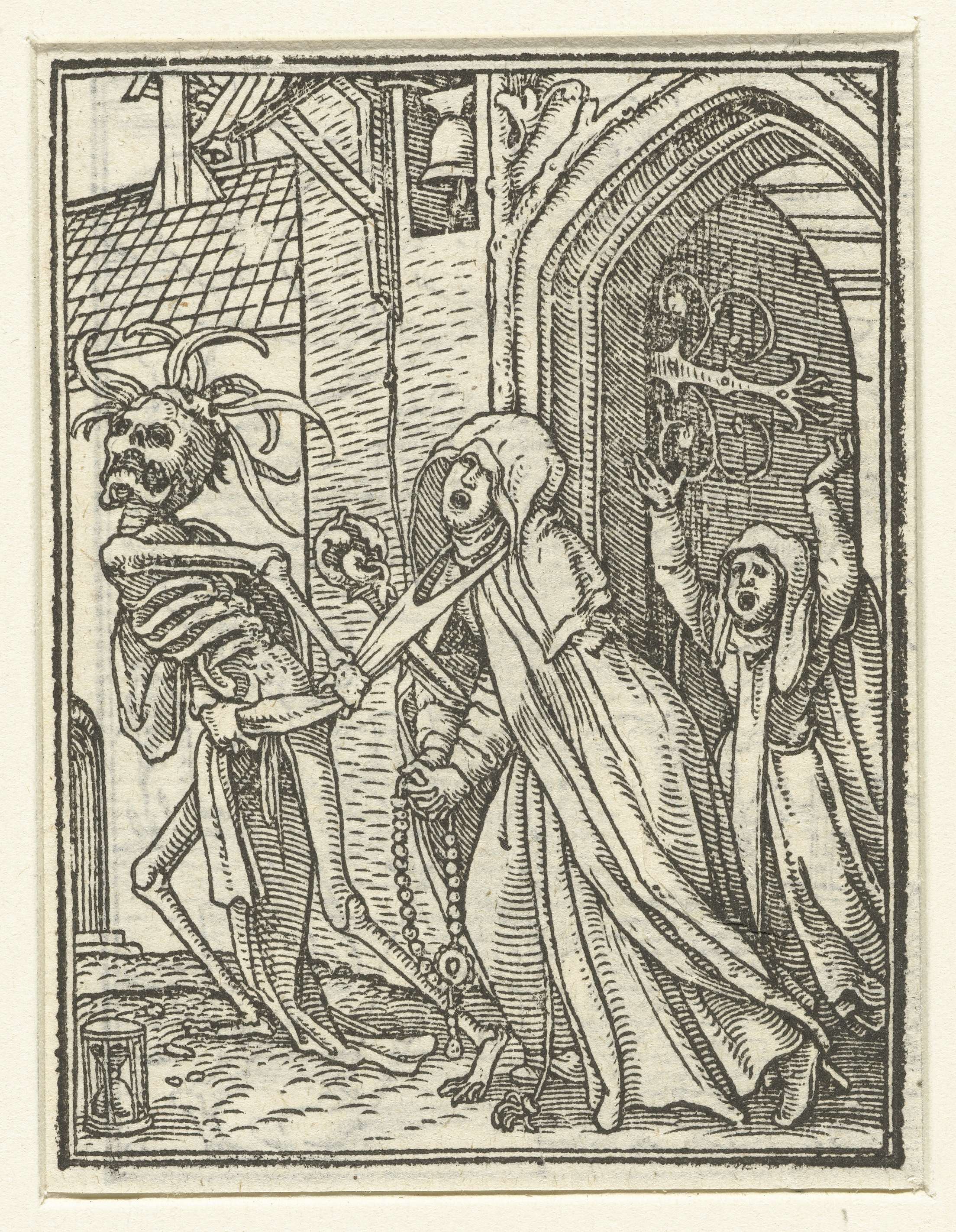 Een abdis wordt aan haar habijt meegesleurd door de Dood uit het klooster terwijl ze haar handen in gebed vouwt en een rozenkrans vasthoudt. De Dood draagt veren op zijn hoofd. Links op de grond staat een zandloper. In de marge boven de prent staat de tekst Ecle. IIII.