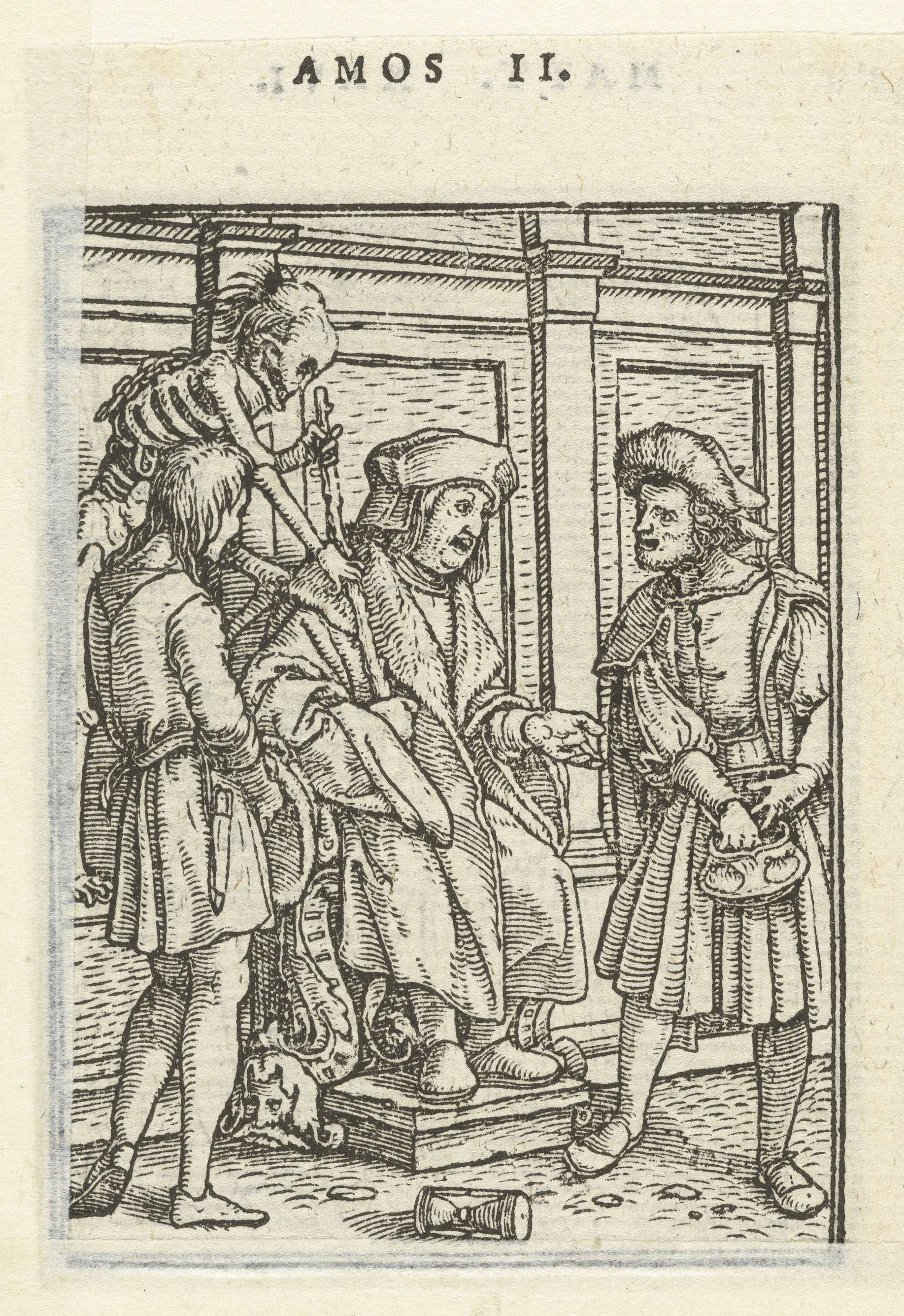 Een rechter is in gesprek met een man die zijn hand in een beurs steekt die hij om zijn middel draagt. De Dood staat achter de rechter en heeft met zijn skelethanden de staf vastgegrepen. In de marge boven de prent staat de tekst Amos II.