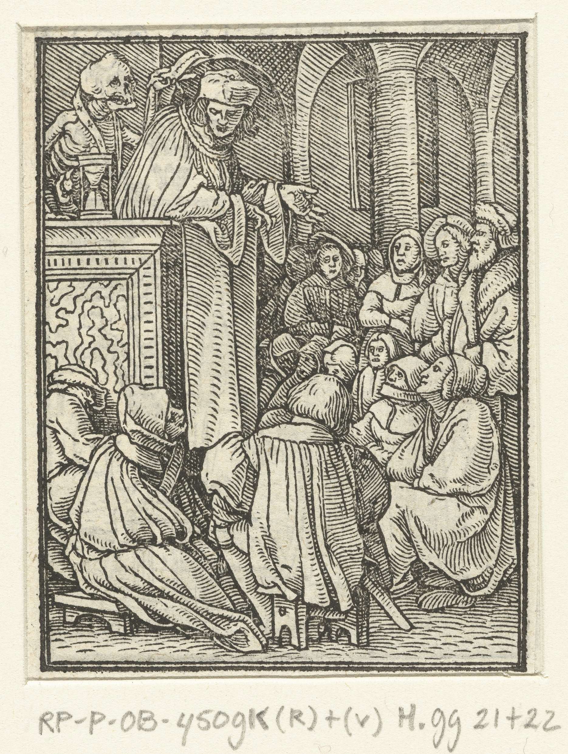 Een predikant staat op een kansel in de kerk en preekt voor de aanwezige mannen en vrouwen. Links zit een slapende man. Achter de predikant op de kansel staat de Dood met een zandloper. In de marge boven de pretn staat de tekst Isaie V.