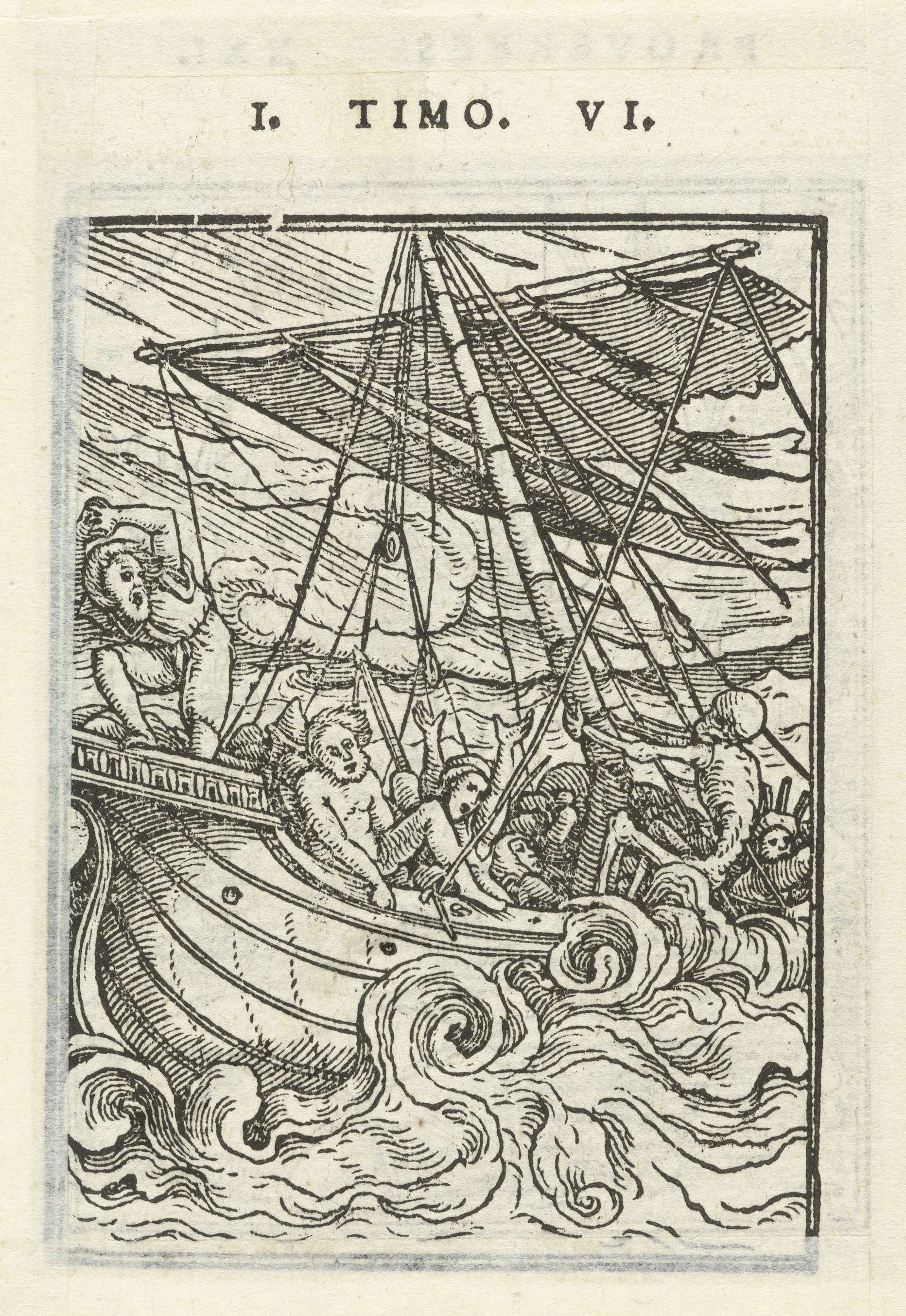 Een schip vaart in een storm met een gebroken mast en gescheurde zeilen op zee met woeste golven. De bemanning en de schipper reageren in paniek op de Dood die zich vastklampt aan de geboken mast. In de marge boven de prent staat de tekst I. Timo. VI.