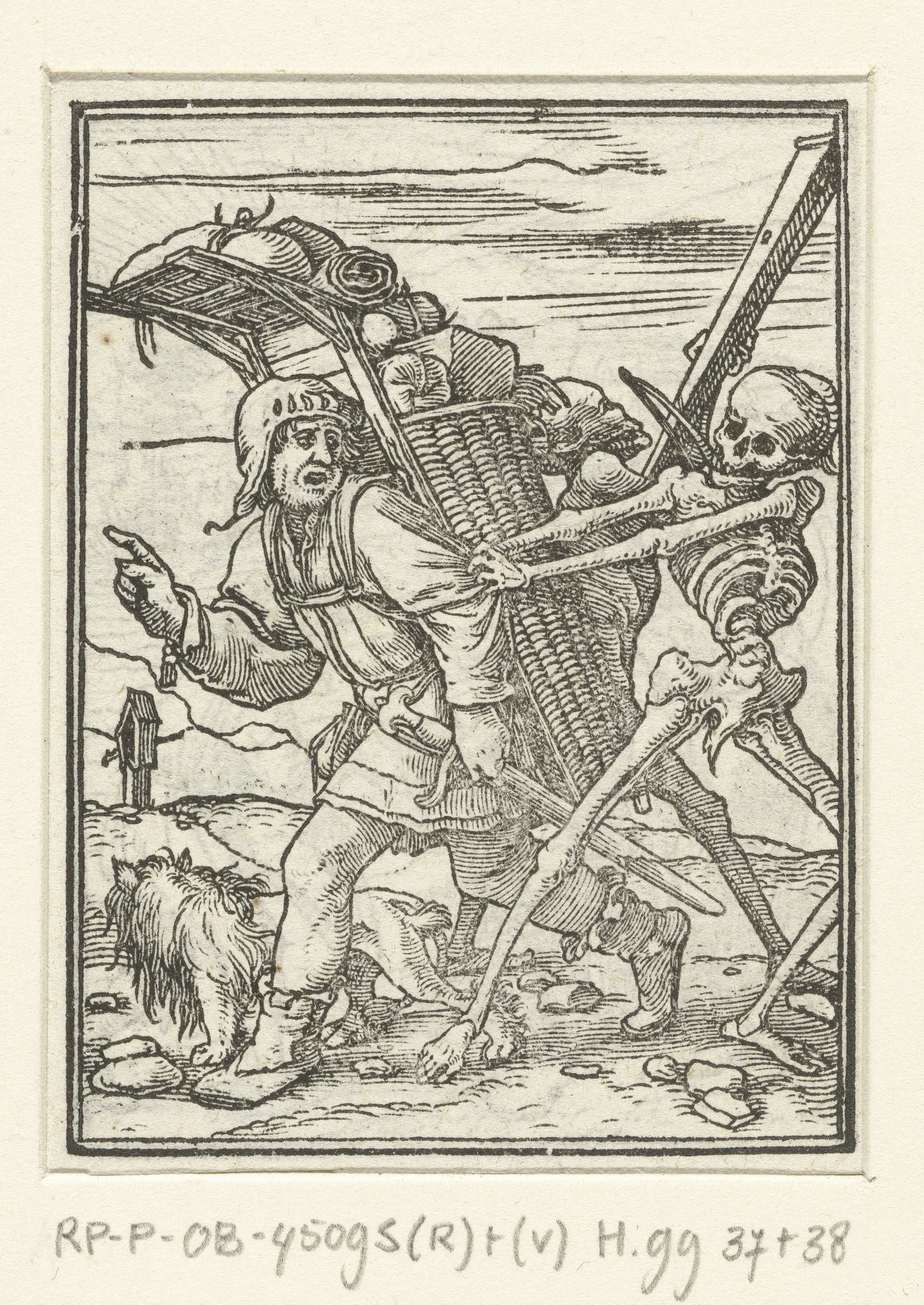 Een marskramer loopt met een grote mand koopwaar op zijn rug en hij wordt tegengehouden door de Dood die hem aan zijn mouw trekt. Achter het tweetal staat een skelet op een strijkinstrument te spelen. Naast de marskramer loopt een hond. In de marge boven de prent staat de tekst Matth. XI.