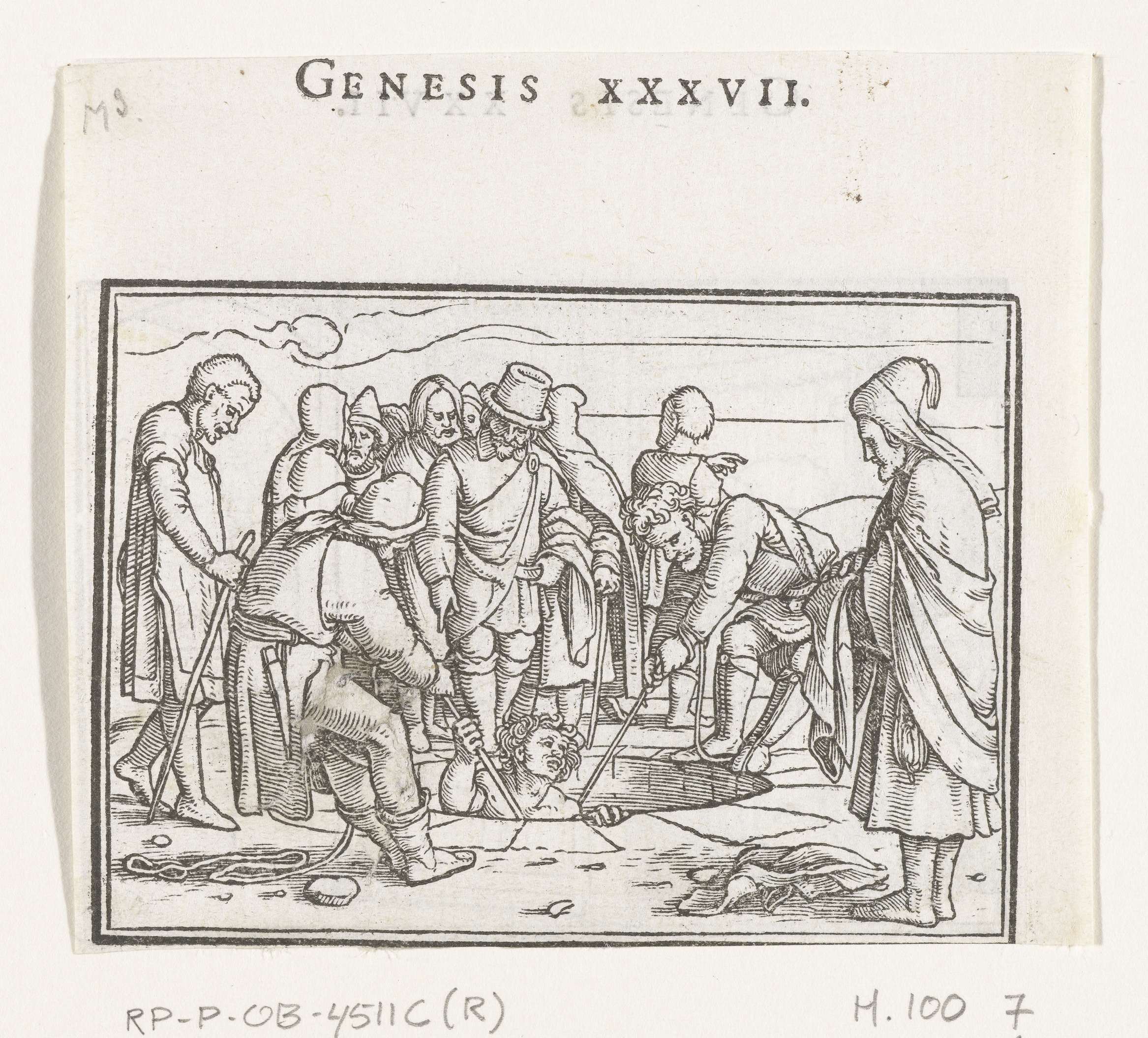 Jozef wordt door zijn broers uit de put getrokken. De kooplieden aan wie zij Jozef verkopen kijken toe. In de marge boven de afbeelding staat de tekst: Genesis XXXVII.