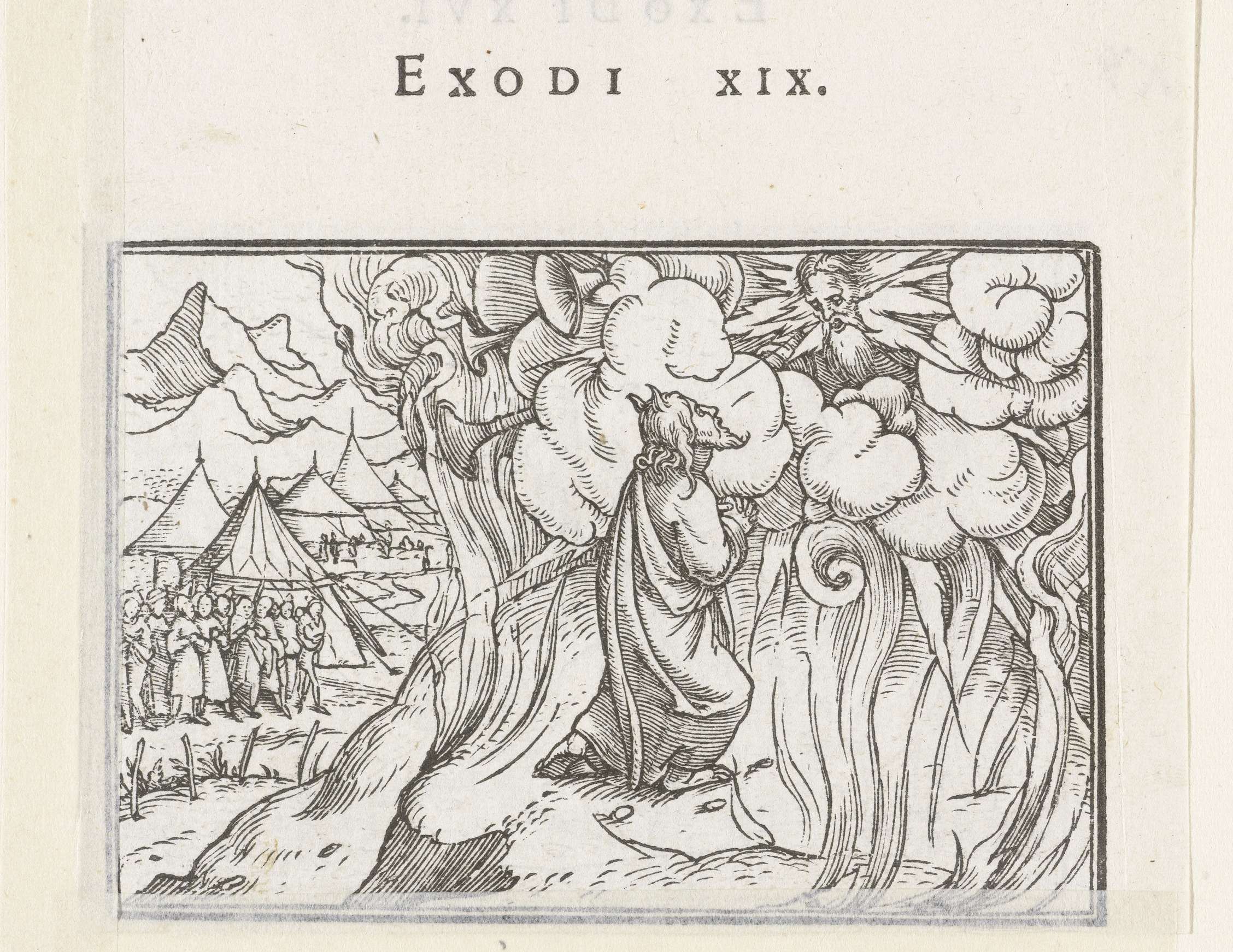 Mozes in gesprek met God op de berg Sinaï, onderaan de voet van de berg staan de Israëlieten in aanbidding omhoog te kijken. Uit de wolken die God omgeven komen bazuinen. In de marge boven de afbeelding staat de tekst Exodi XIX.