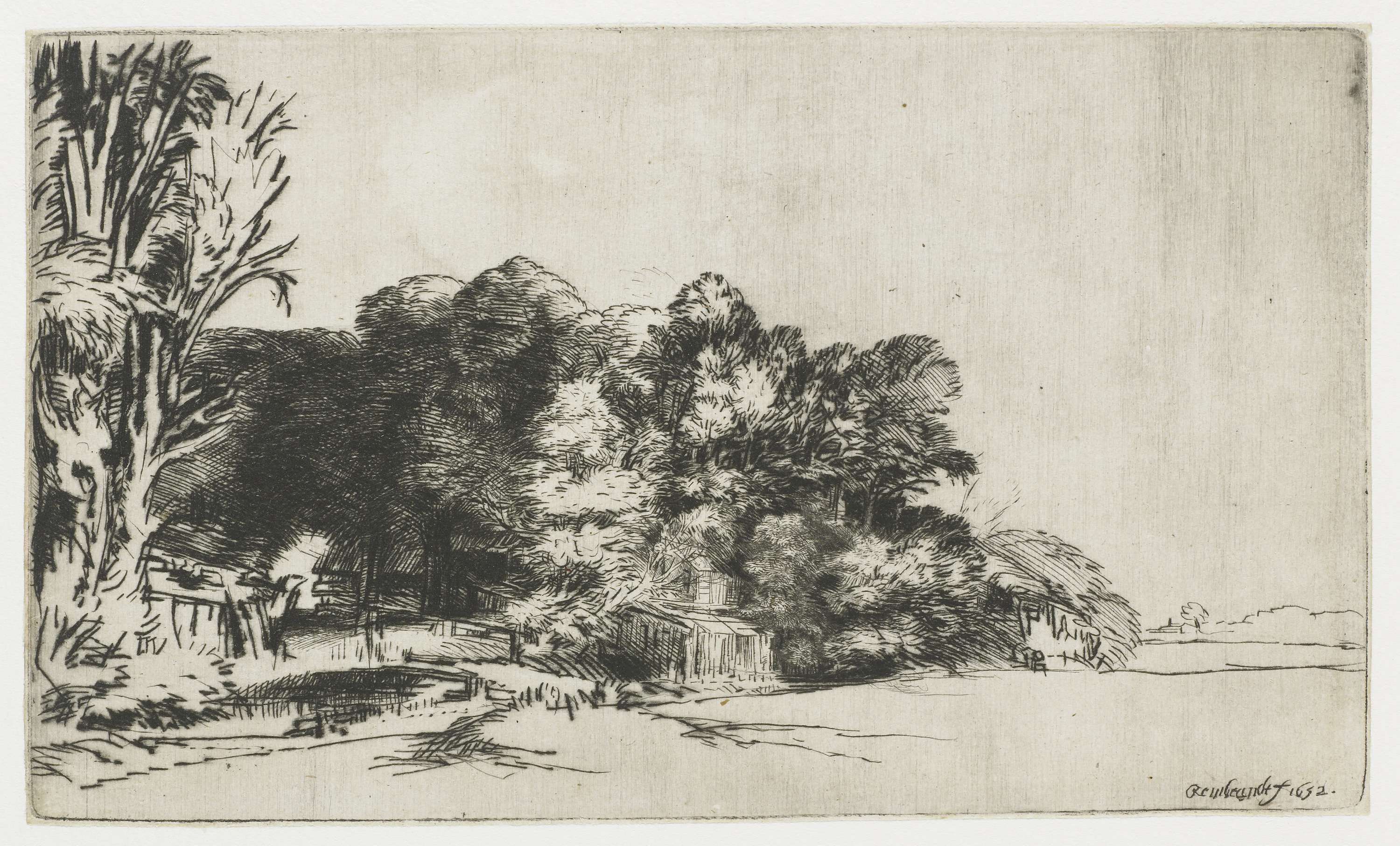 De locatie van dit boerenhuis is nog altijd onbekend. Rembrandt kwam hier regelmatig om het huis dat verscholen ligt in het bos te tekenen of te etsen. Hier gebruikte hij droge naald, waarbij hij direct in de etsplaat kraste. Zo ontstaat een braam, een opstaand randje dat bij het afdrukken een fluwelige lijn veroorzaakt. Het ...