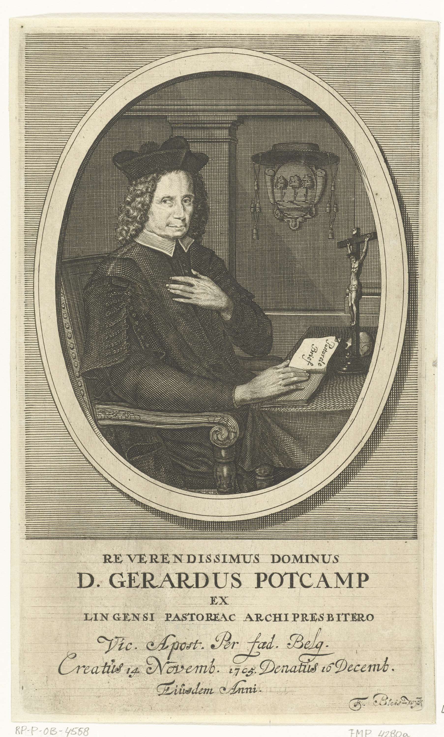 Portret van Gerard Potcamp, pastoor en aartspriester van Lingen, zittend aan tafel met crucifix, aan de wand hangt zijn wapen. Kniestuk in ovale omlijsting. Aangesteld 14 november 1705.