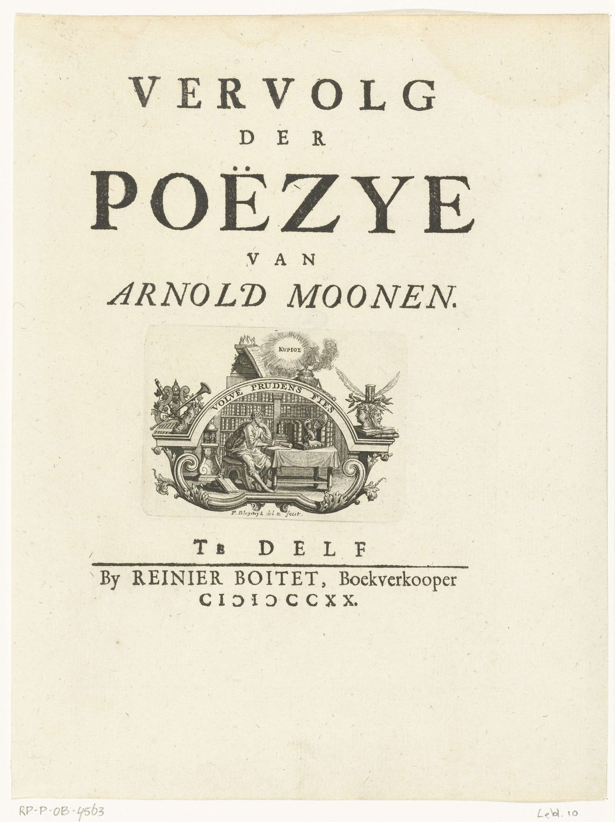 Titelvignet met geleerde schrijvend aan een tafel in studeervertrek. Op de tafel krult een slang zich om een spiegel en kijkt naar zijn reflectie. De omlijsting van het vignet is bekroond met verschillende attributen zoals muziekinstrumenten, religieuze symbolen zoals een wierookvat en daarnaast het dubbele hoofd van Janus en een gevleugelde zandloper.