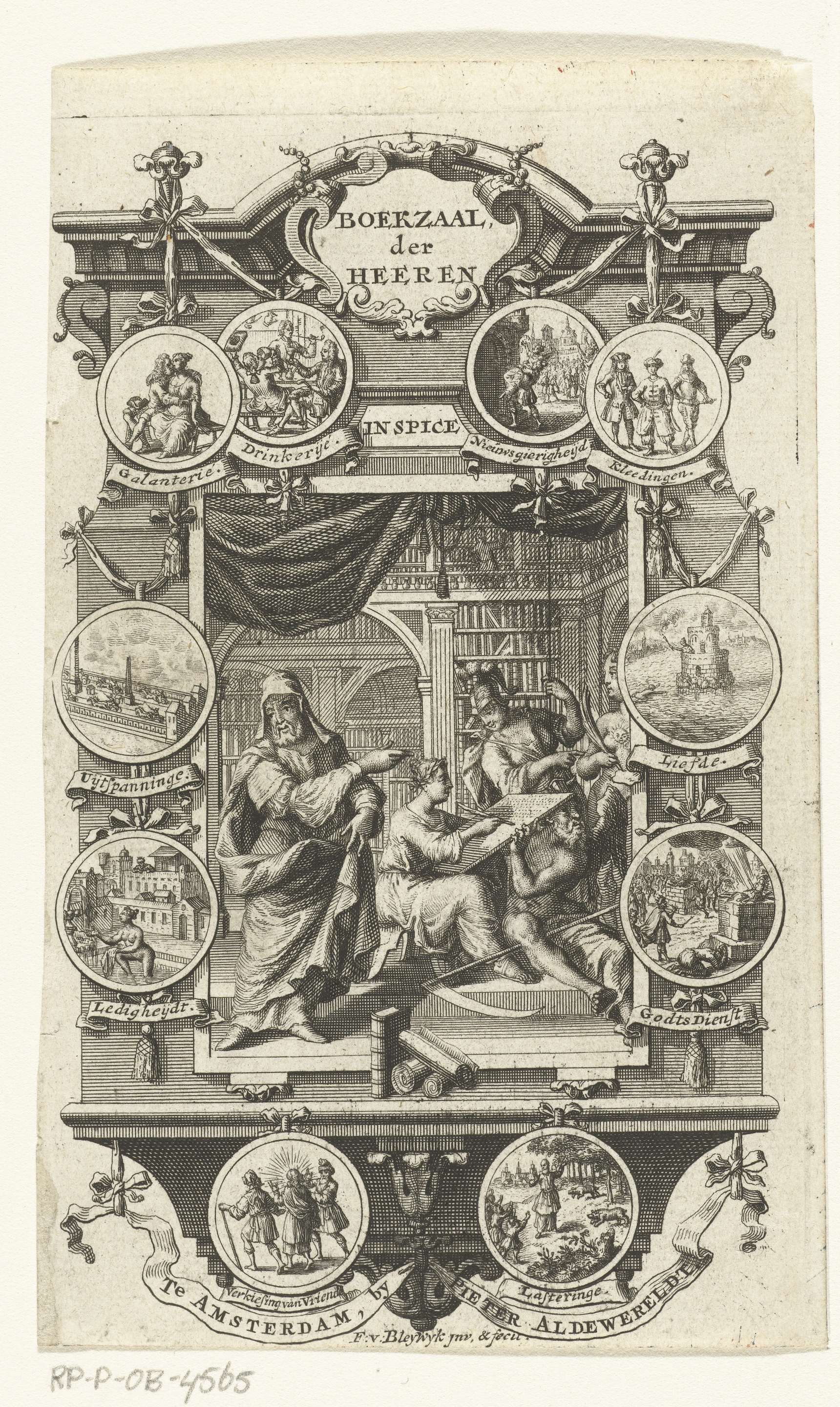Interieur van bibliotheek met Geschiedenis en Vader Tijd in omlijsting met medaillons waarop onderwerpen van literatuur staan