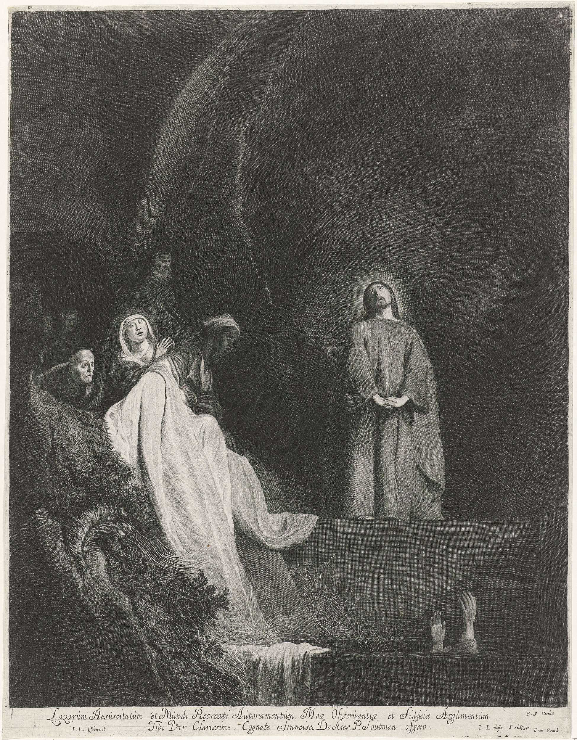 Christus staat met gevouwen handen bij het graf van de dode Lazarus en beveelt hem terug tot leven te komen (Joh. 11:43-44). Links kijken toeschouwers geschokt toe. In de marge een tweeregelig onderschrift.