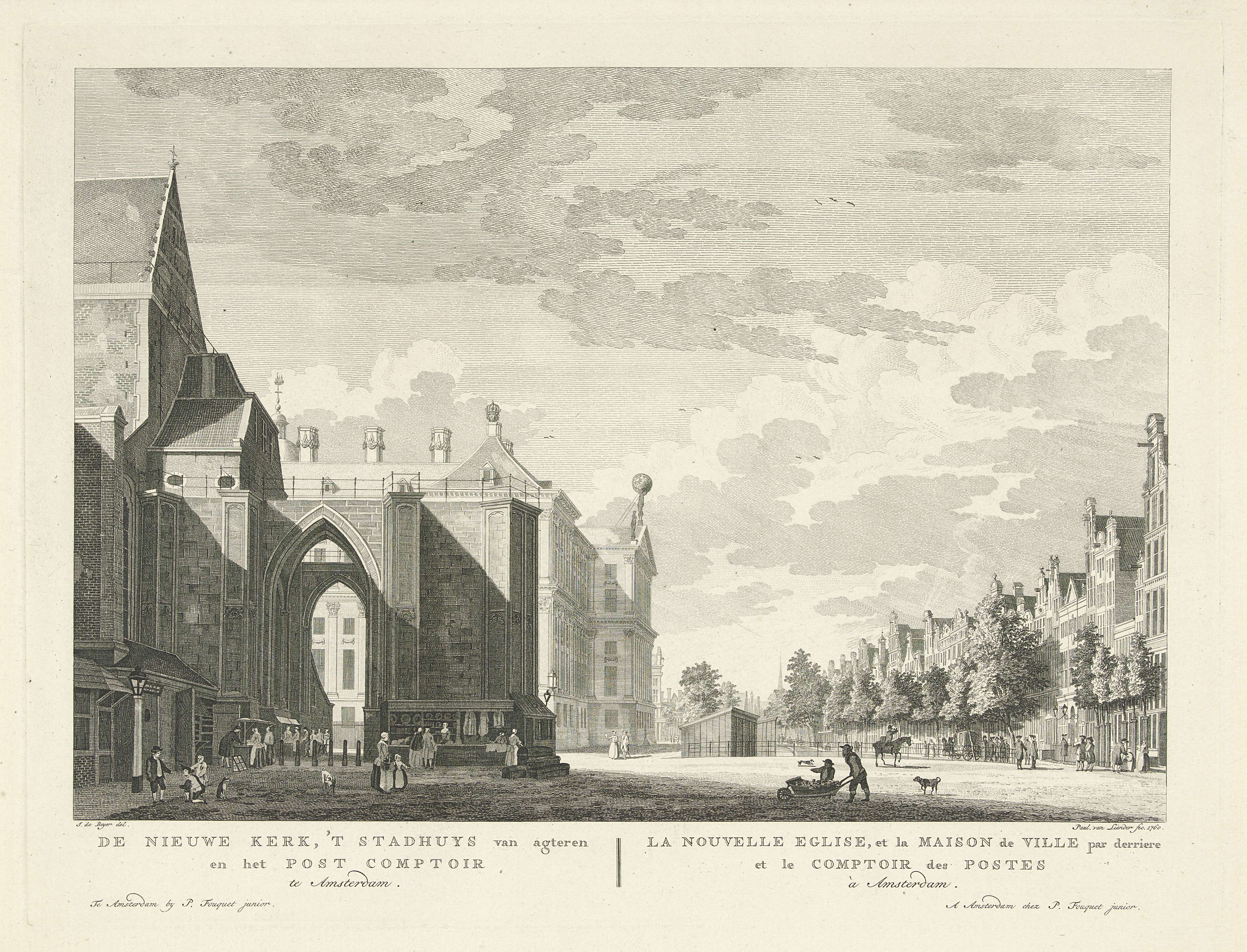 Gezicht op de Nieuwezijds Voorburgwal met de achterkant van de Nieuwe Kerk en het Stadhuis op de Dam
