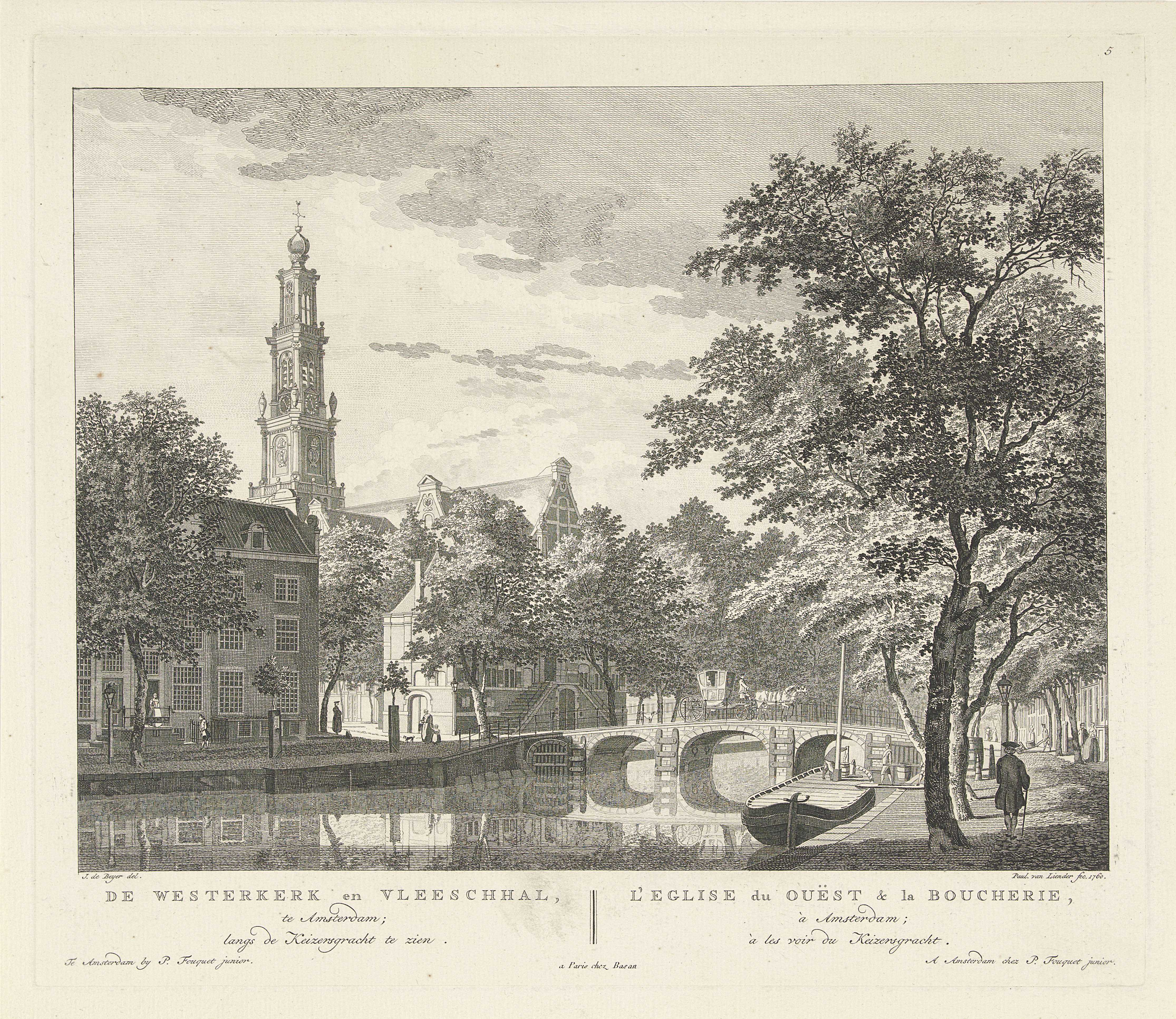 Gezicht op de Westerkerk en de daarvoor gelegen Westerhal (gebruikt als vleeshal), gezien vanaf de Keizersgracht. Onder de voorstelling de titel in het Nederlands en Frans. Rechtsboven genummerd: 5.