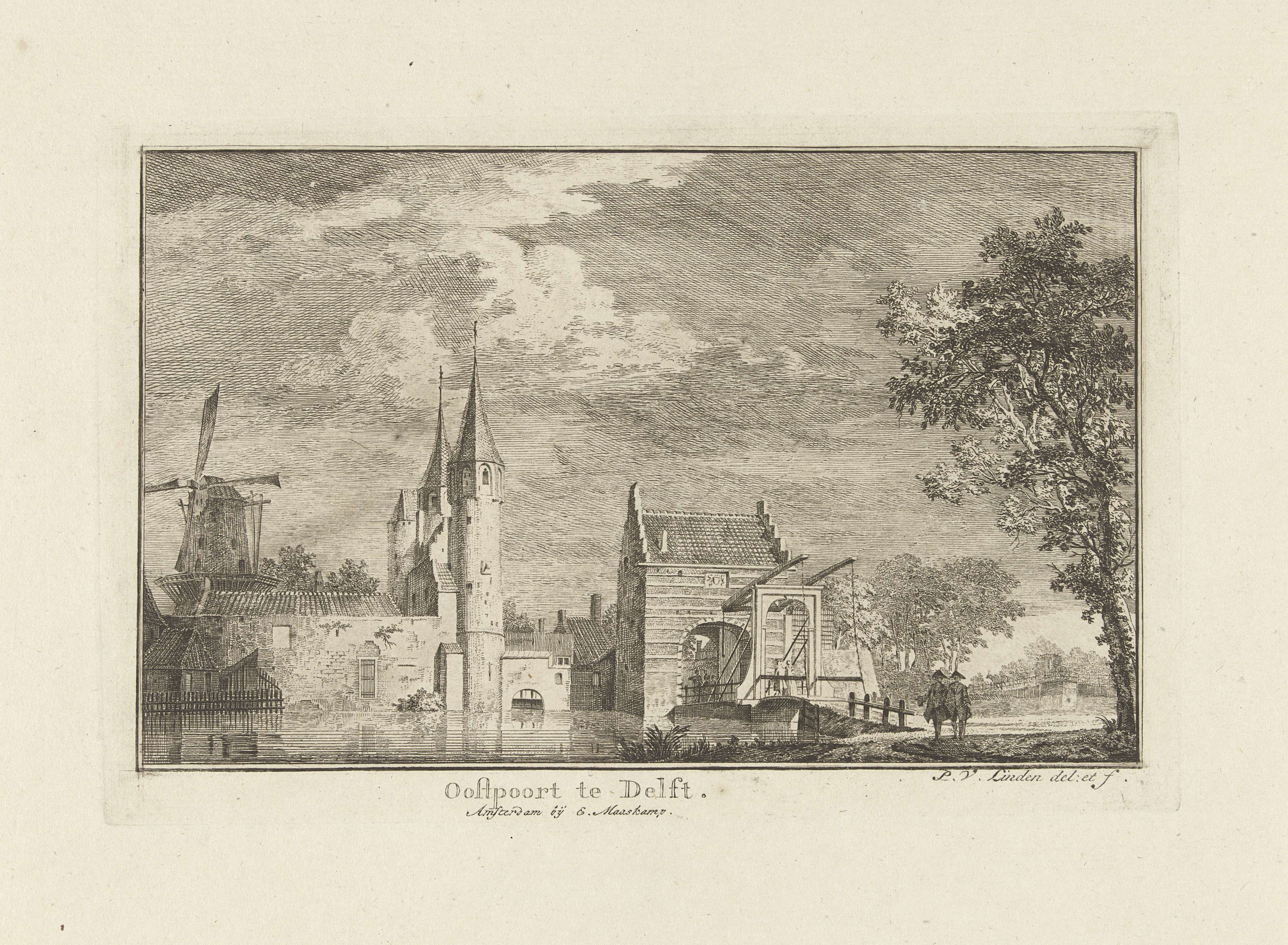 Gezicht op de Oostpoort in Delft, bestaande uit een land- en waterpoort. Rechts op de voorgrond lopen twee figuren op een weg.