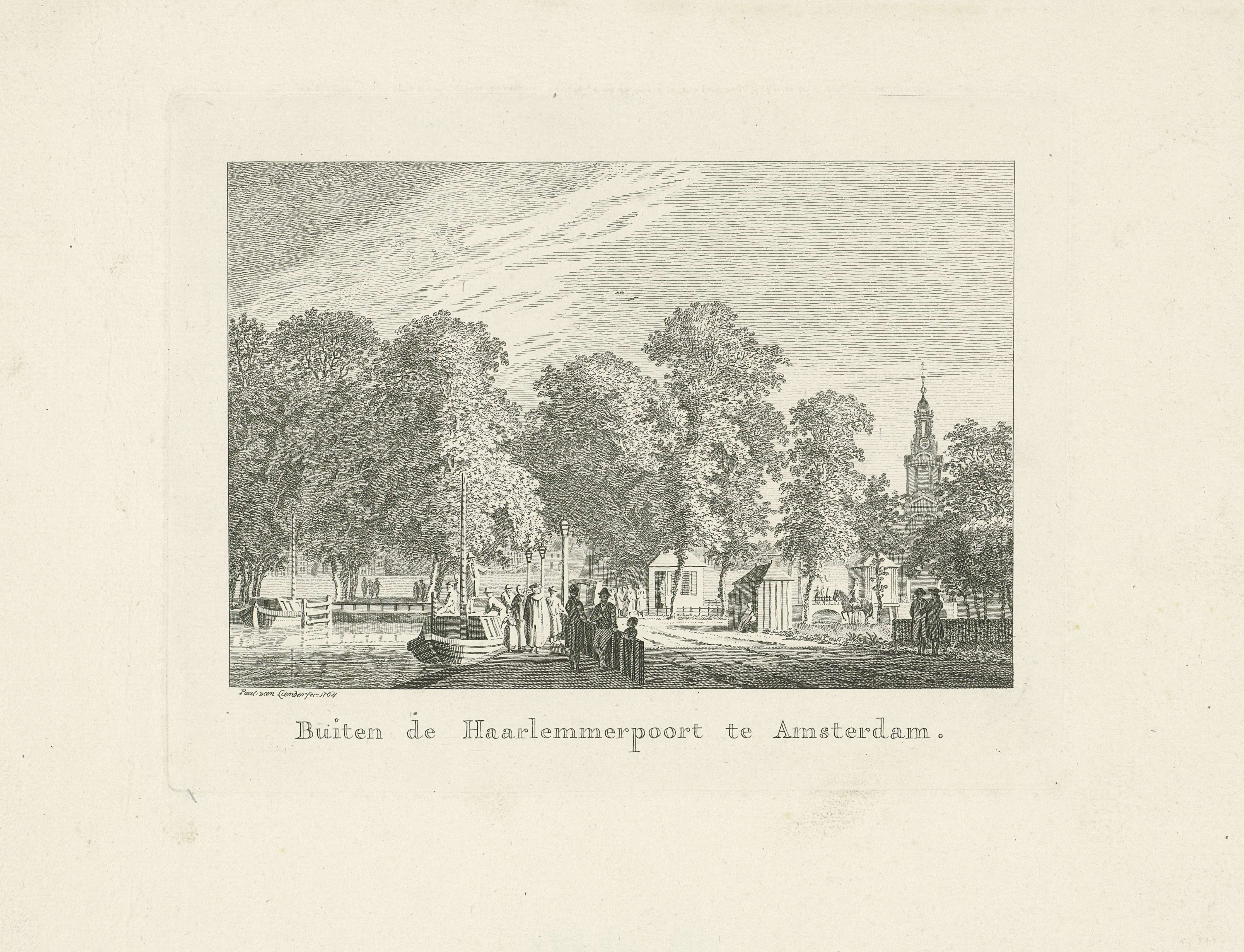Gezicht buiten de Haarlemmerpoort te Amsterdam. Aan het begin van de Haarlemmerweg en de Haarlemmertrekvaart stappen passagiers op een trekschuit. Rechts op de achtergrond ligt de Haarlemmerpoort. Deze door Hendrik de Keyser ontworpen Haarlemmerpoort werd tussen 1615 en 1618 gebouwd.