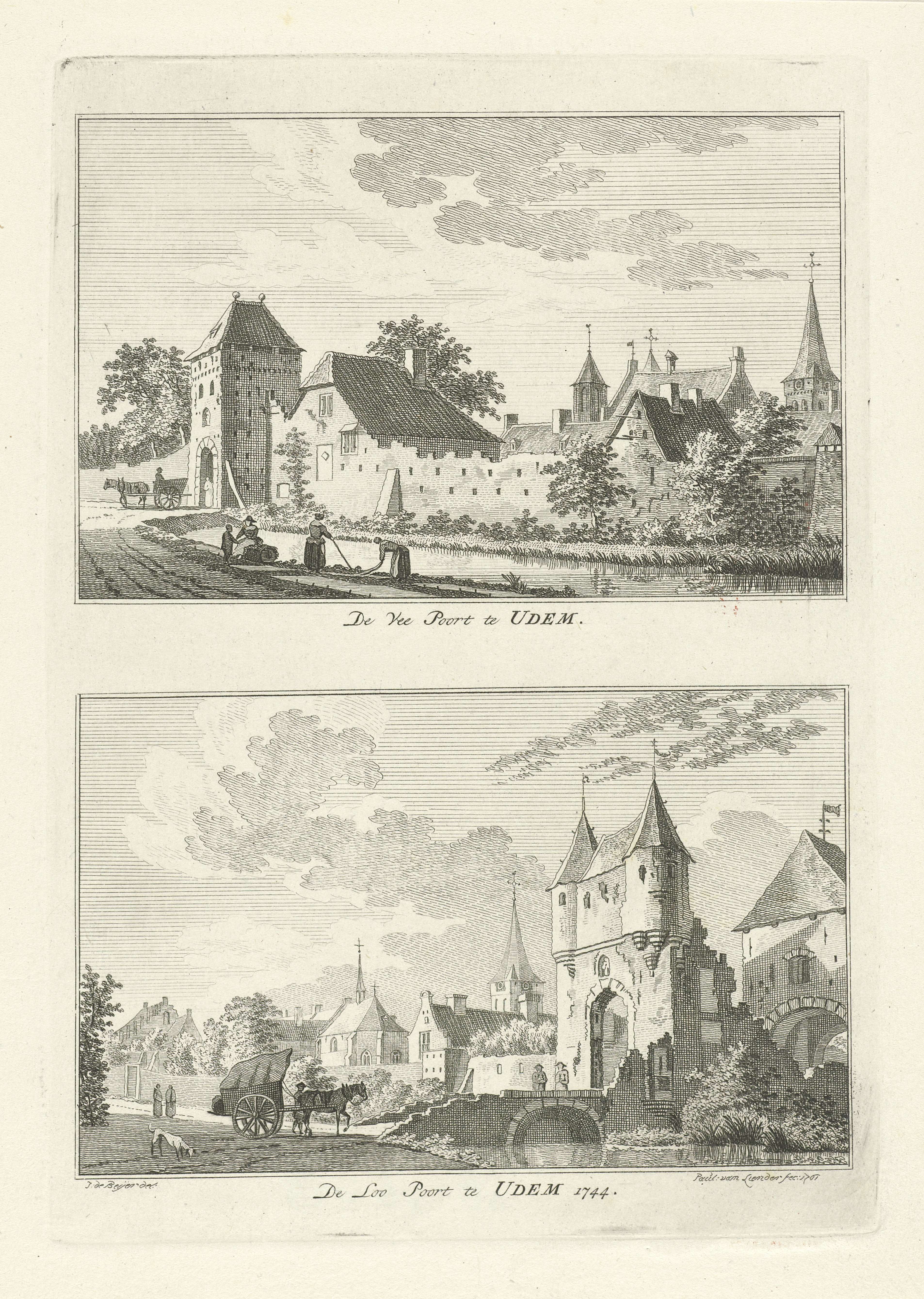 Twee voorstellingen van één plaat. Gezichten op de Veepoort (boven) en de Loopoort (onder) te Uedem, Duitsland. De prent maakt deel uit van een 100-delige serie met gezichten op dorpen en steden te Kleef.