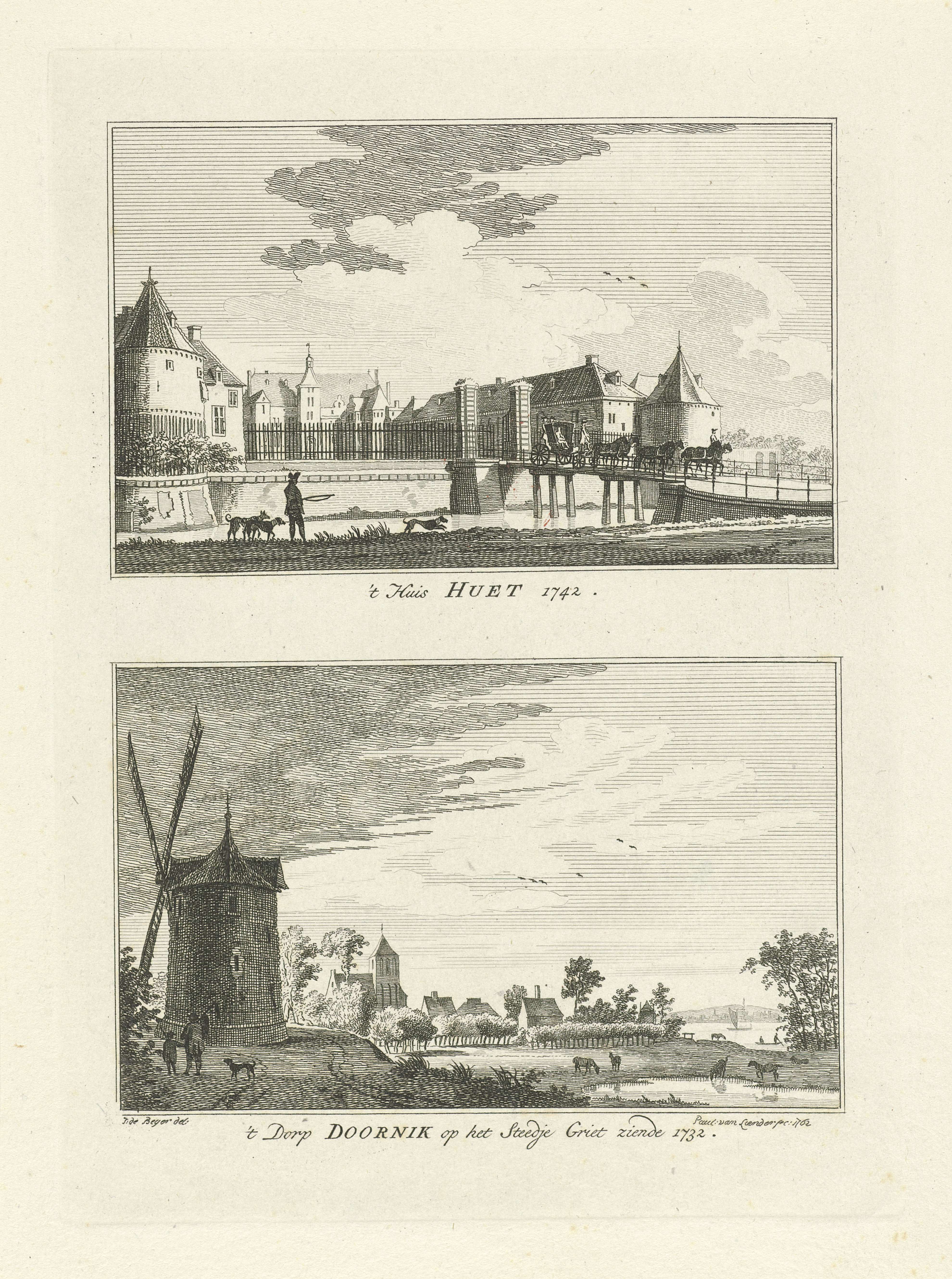 Twee voorstellingen van één plaat. Gezichten op het Huis Huet (boven) en het dorp Dornick, bij Kleef, met een gezicht op Grieth (onder). De prent maakt deel uit van een 100-delige serie met gezichten op dorpen en steden te Kleef.