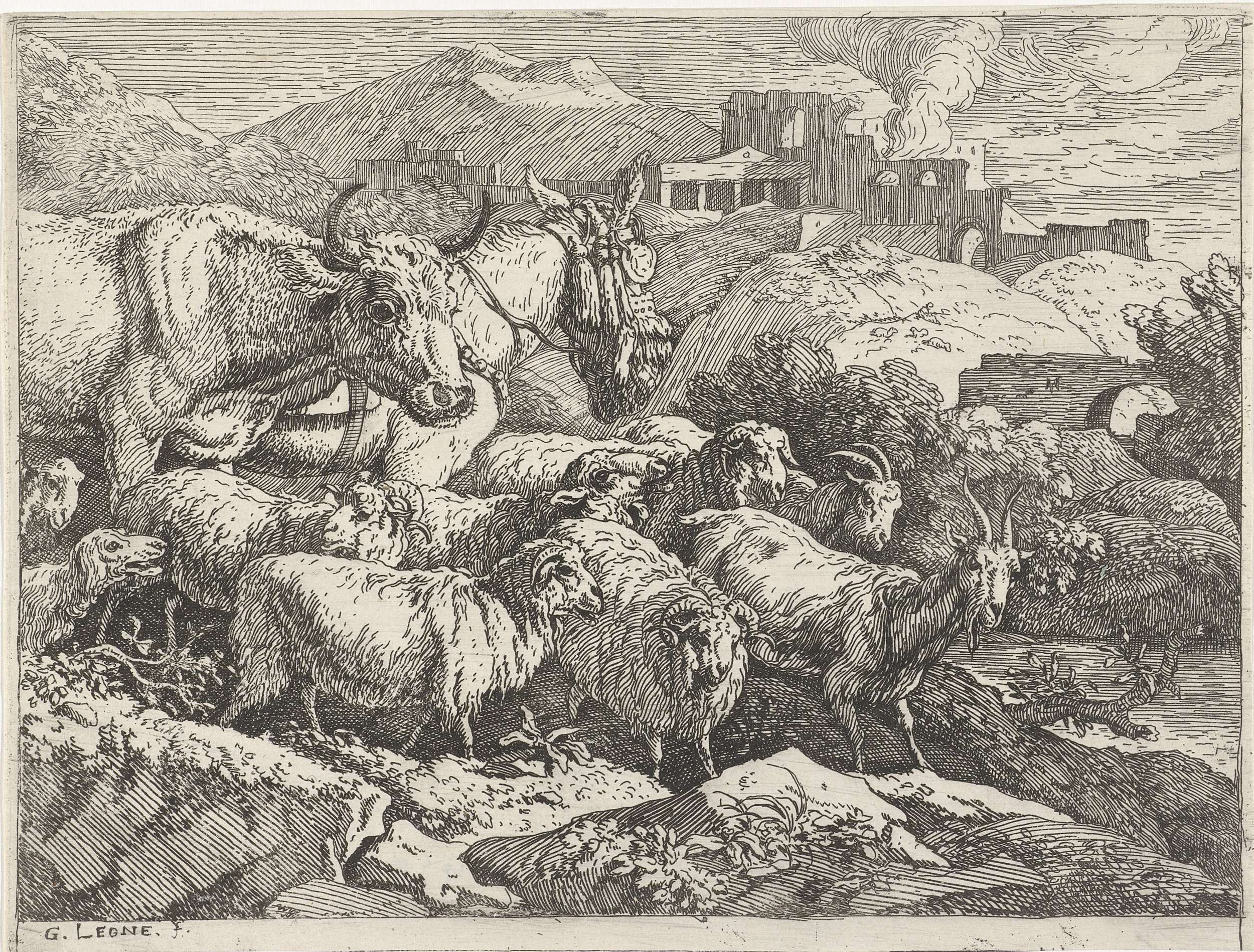 Bergachtig landschap met een kudde schapen, geiten, een koe en een ezel bij de oever van een rivier. In de verte ruïnes. De prent maakt deel uit van een serie prenten met voorstellingen van dieren in een landschap.