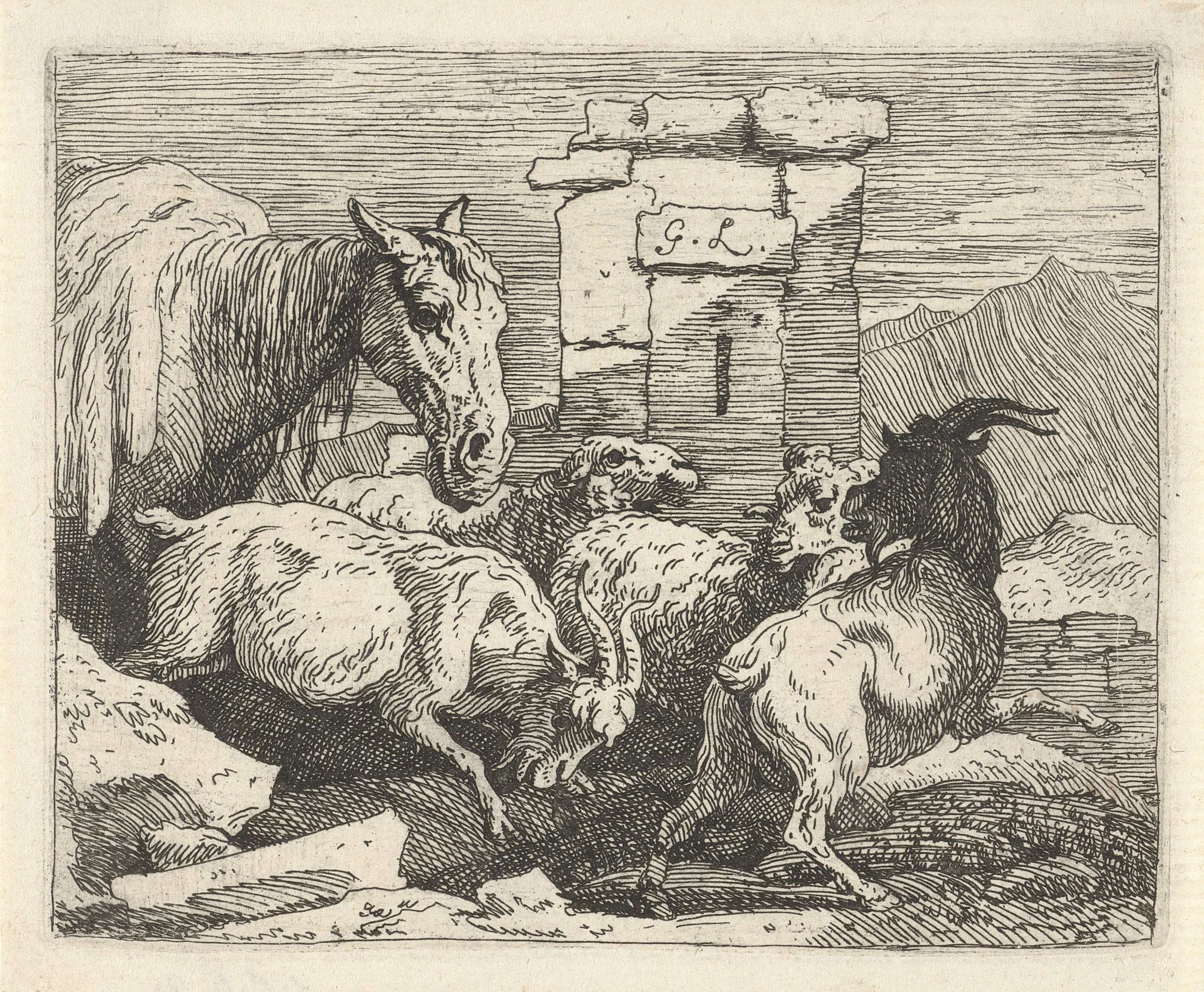 Een paard, twee geiten en twee schapen in een landschap. De prent maakt deel uit van een negendelige serie prenten met voorstellingen van diverse dieren.
