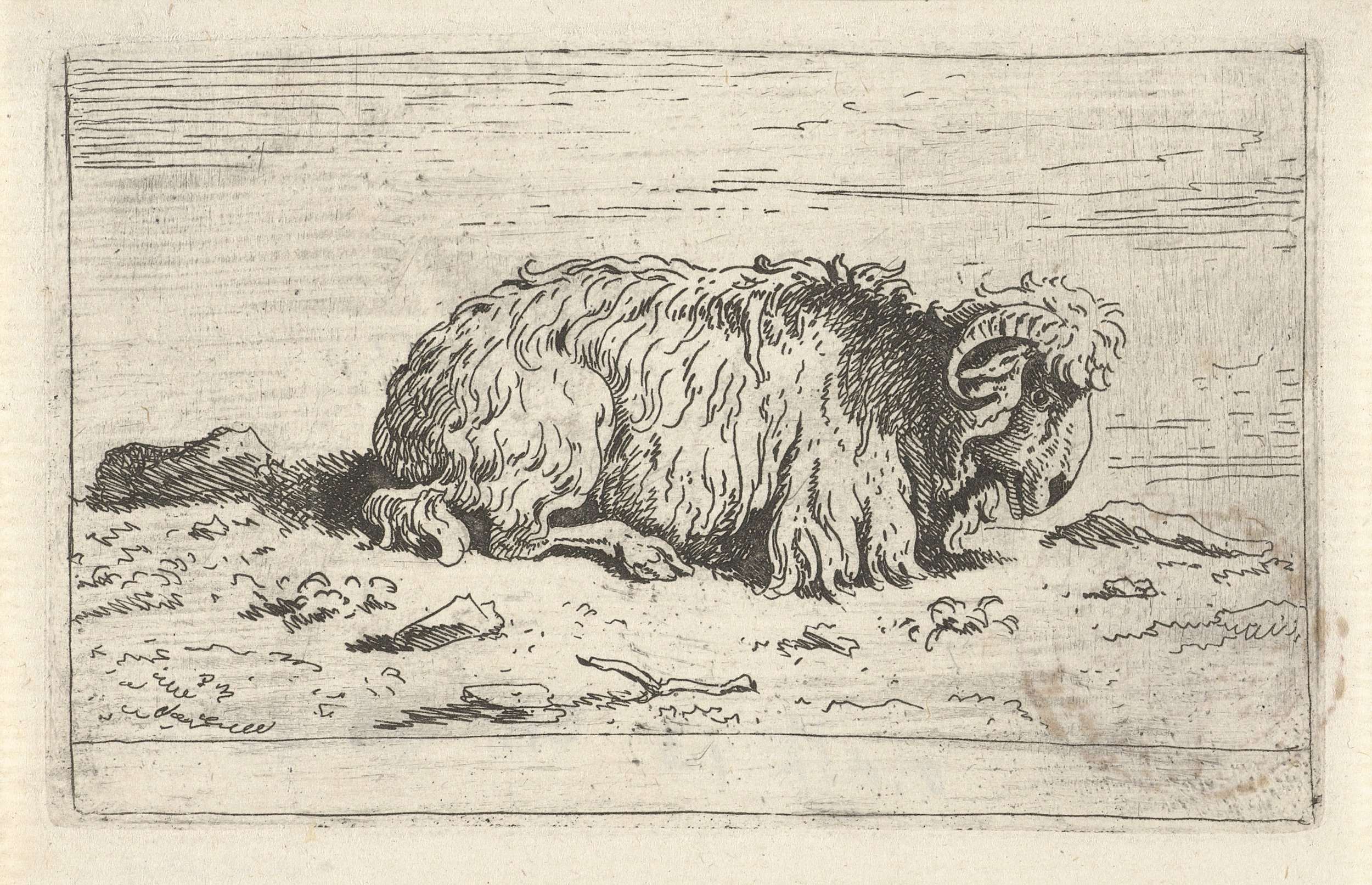 Liggende ram, naar rechts. De prent maakt deel uit van een negendelige serie prenten met voorstellingen van diverse dieren.