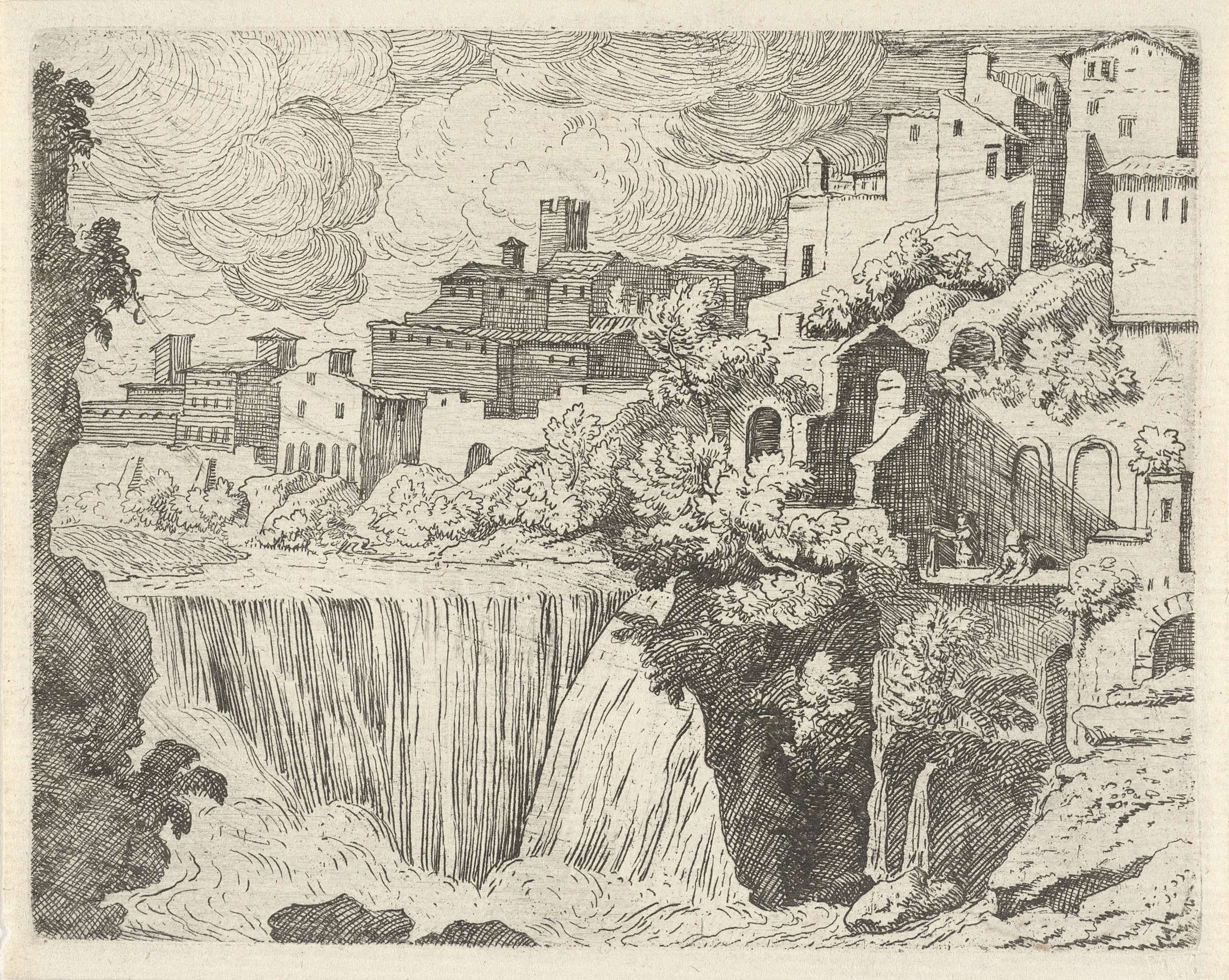 Gezicht op een stad aan een rivier in een heuvelachtig landschap. Op de voorgrond stroomt een waterval. De prent maakt deel uit van een negendelige serie prenten met voorstellingen van diverse dieren.