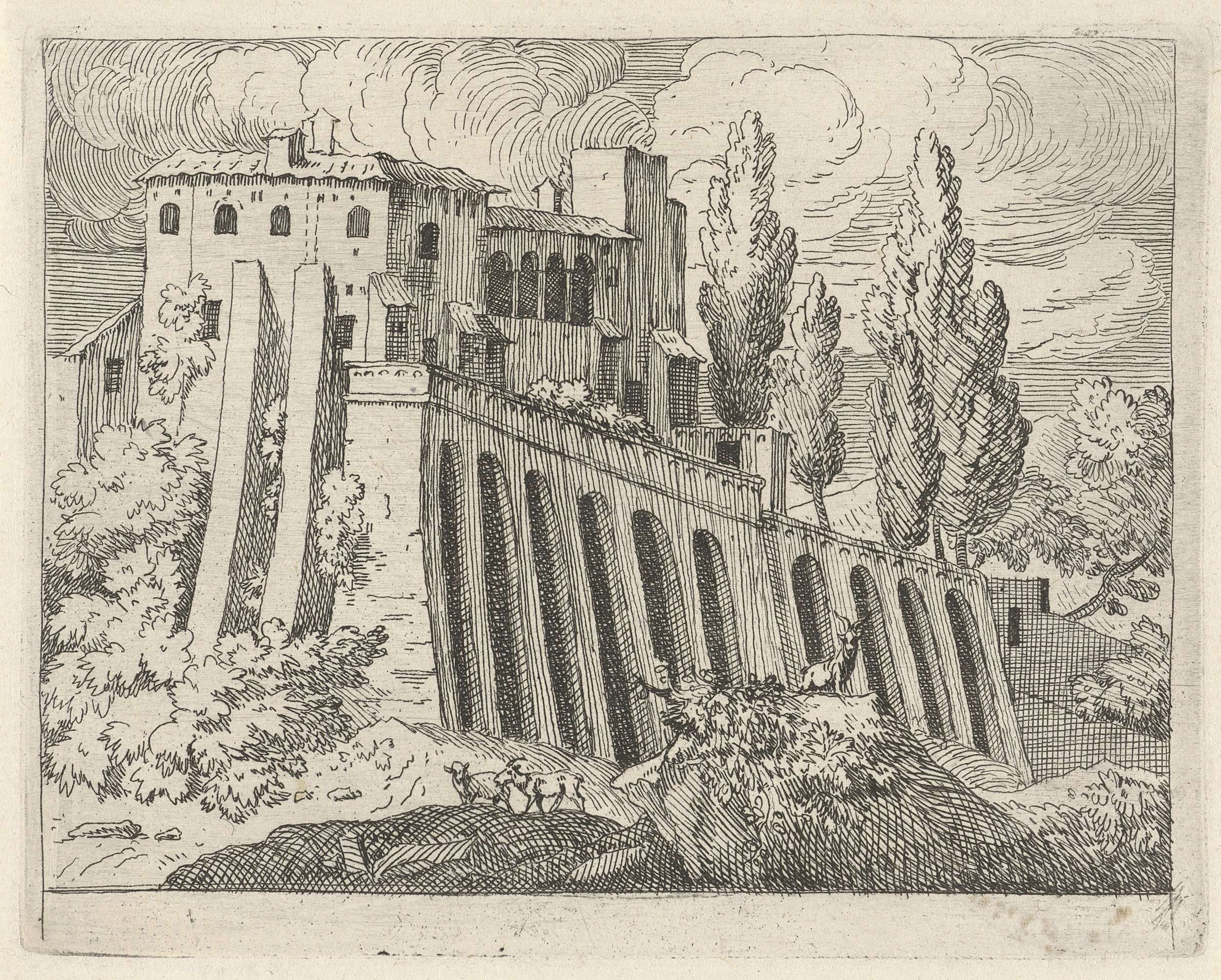 Een gebouw in een landschap, het terras rust op hoge arcaden. De prent maakt deel uit van een negendelige serie prenten met voorstellingen van Italiaanse landschappen.