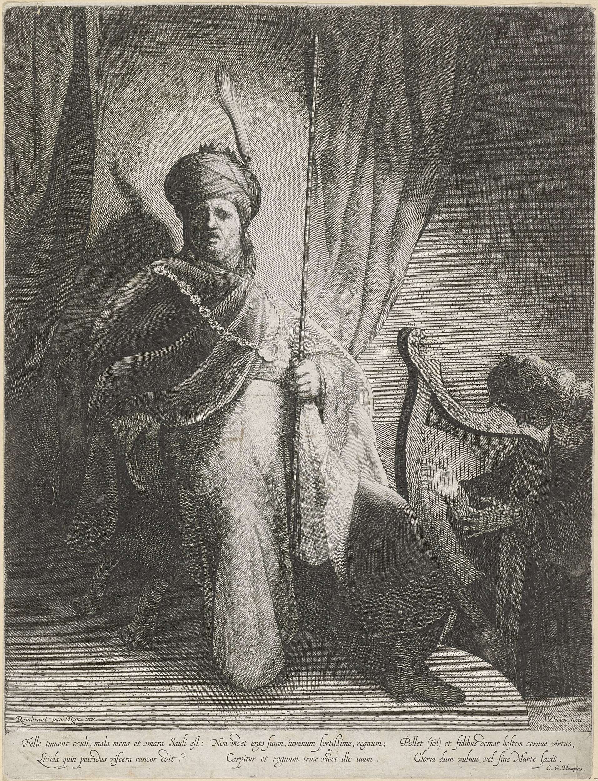 Koning Saul zit op een troon met een speer in zijn hand, naast hem bespeelt David de harp. In de marge een zesregelige tekst in Latijn.
