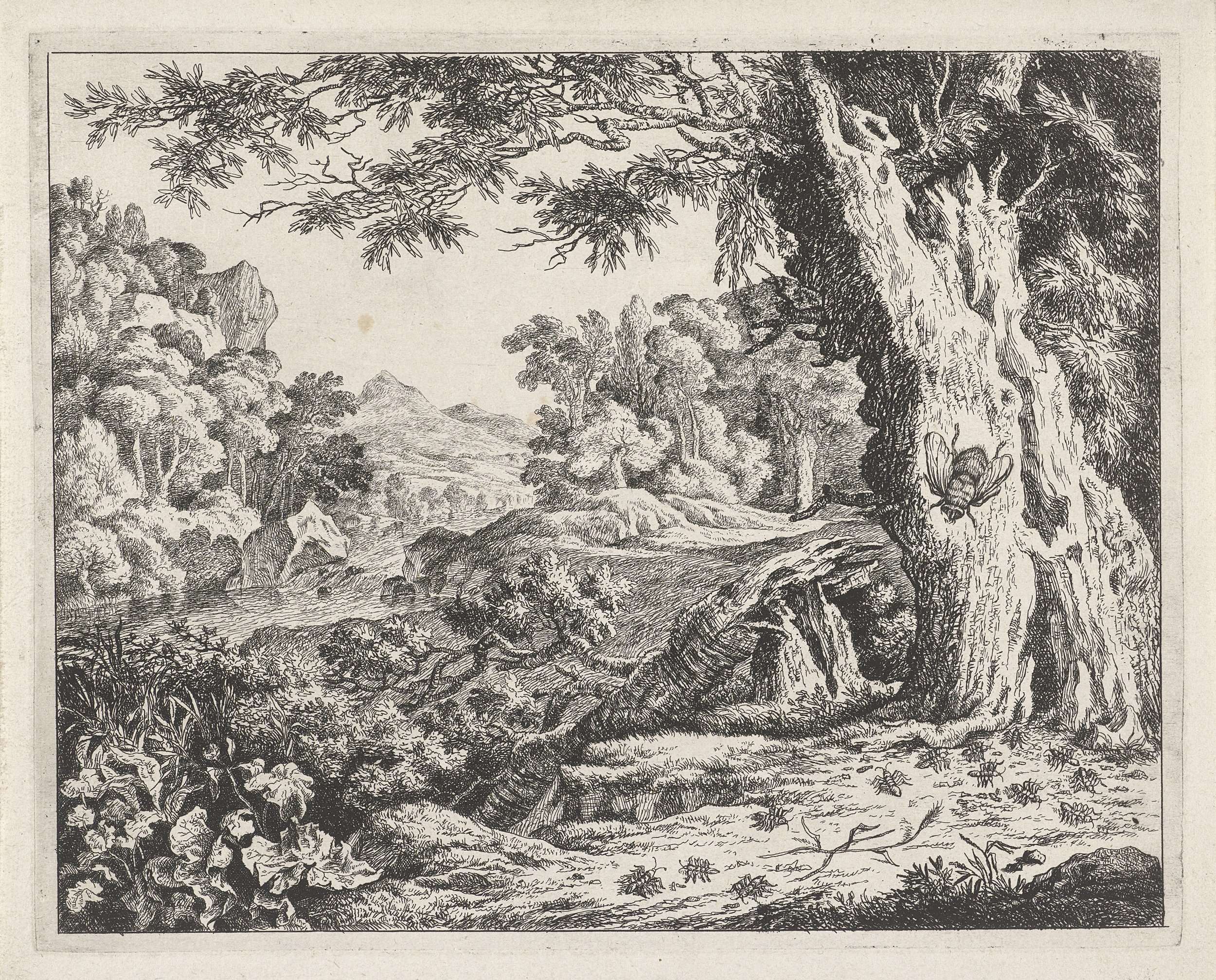 Gezicht op een landschap met rivier. Op de voorgrond zit een grote bij op de stam van een boom, links hiervan een stronk van een omgevallen boom. Over de grond lopen talloze mieren.