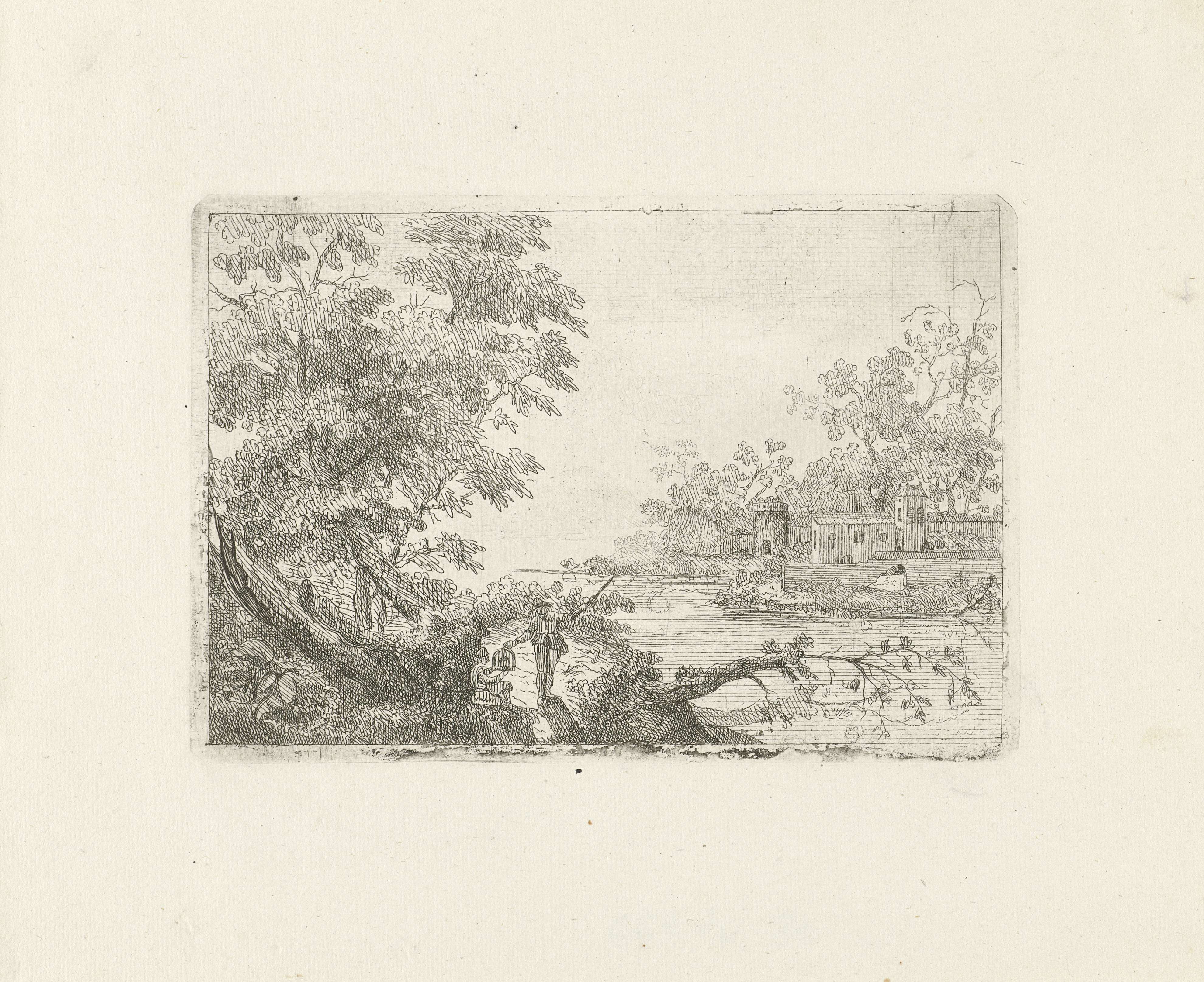 Riviergezicht met op de oever twee figuren die een vogelkooi bij zich dragen.