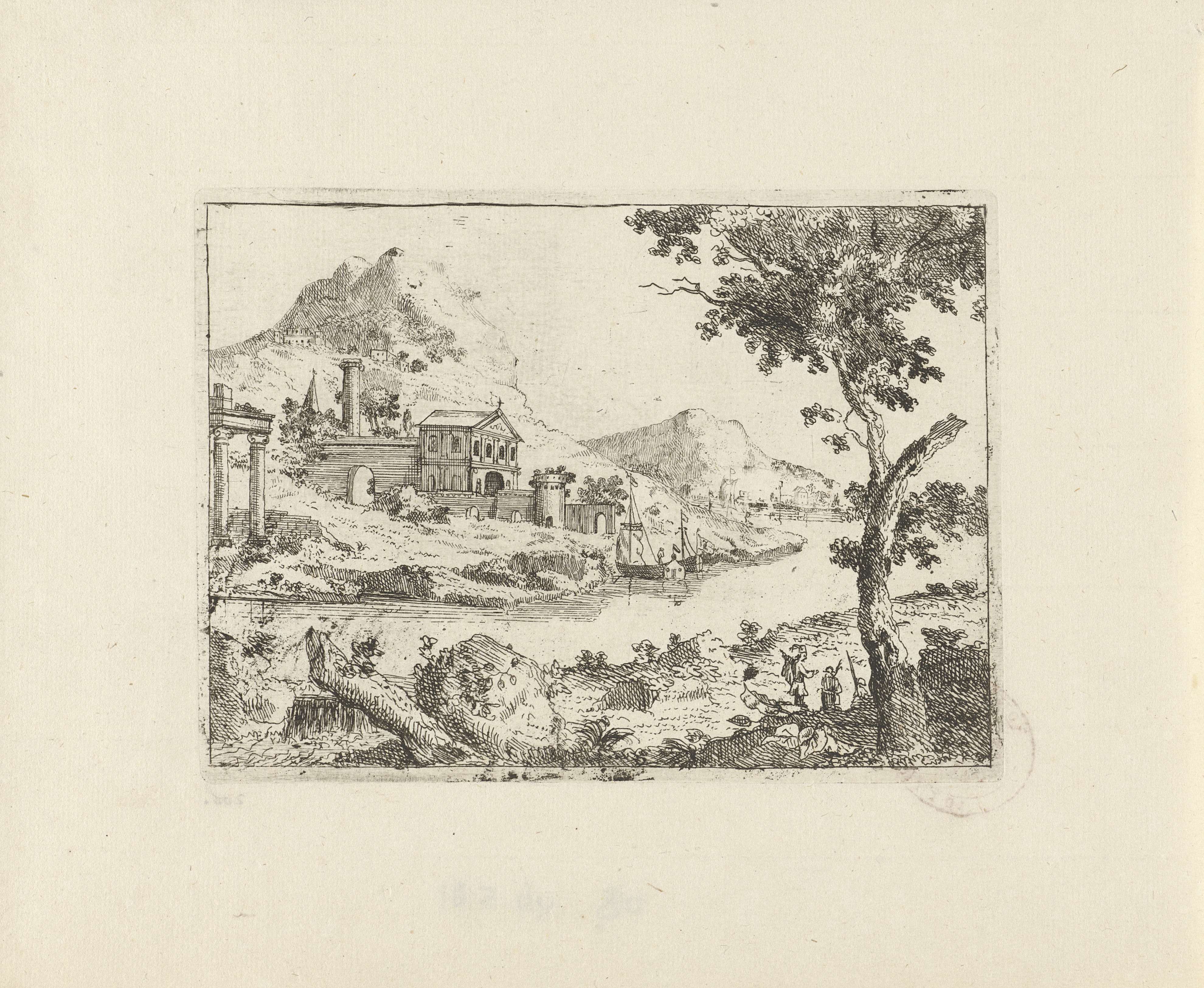 Rivierlandschap met op de oever een kerk en enkele restanten van antieke bouwwerken.