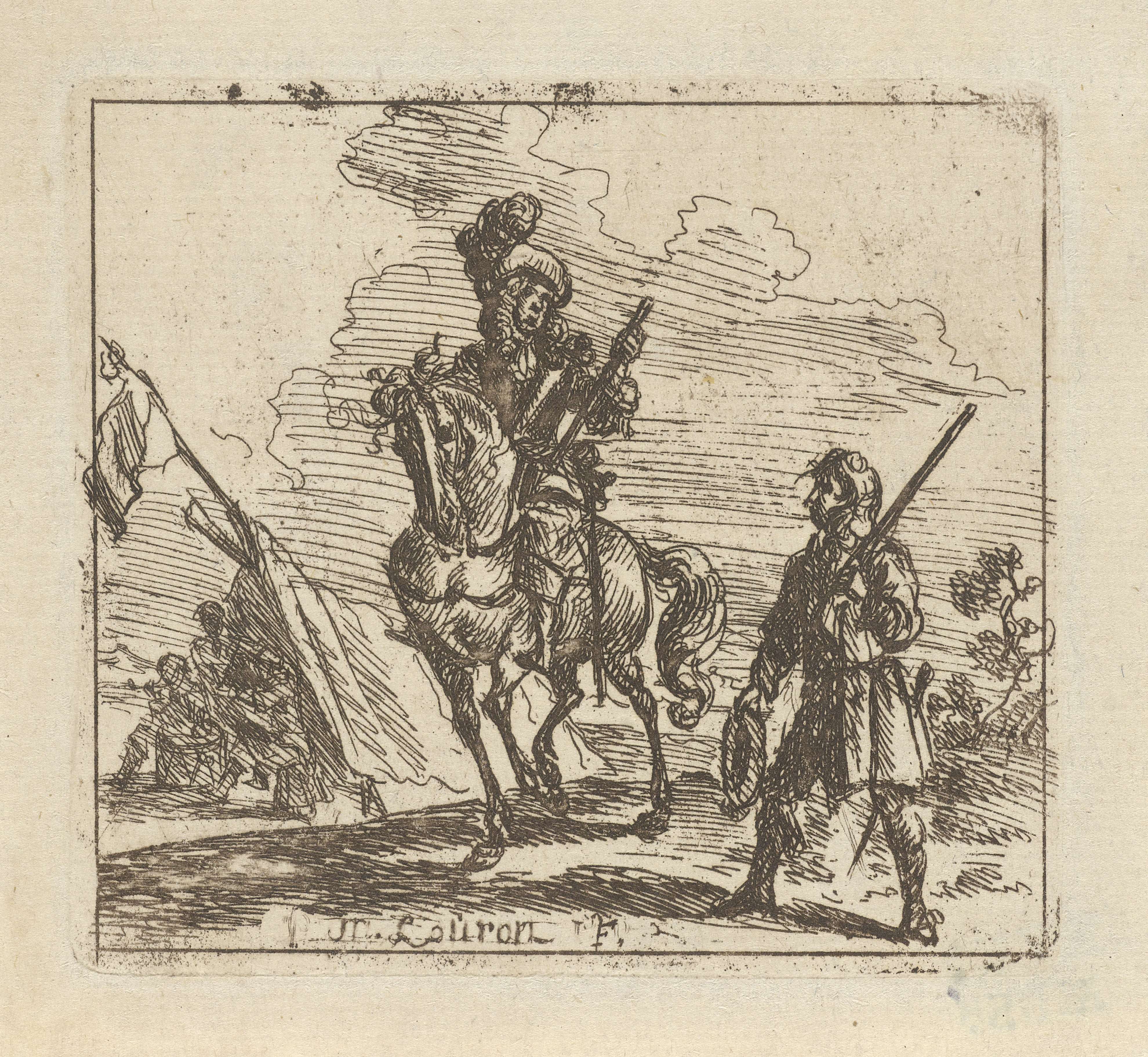 Een generaal te paard deelt bevelen uit aan een musketier. Links op de achtergrond staat een legertent.
