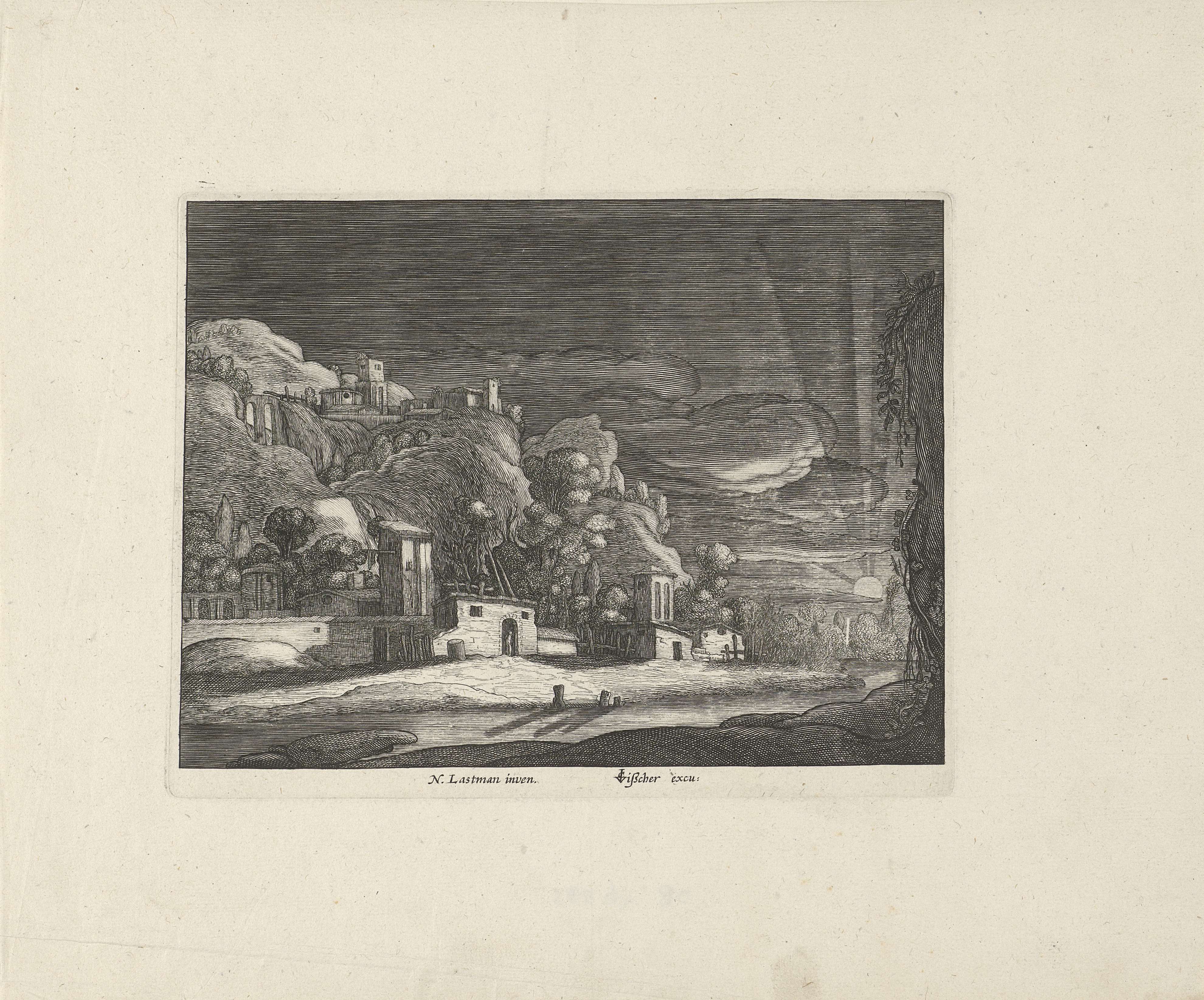 Gezicht op het dorp Bethanië, de enige plek op aarde waar Christus welkom was. Links staan huizen op en aan de voet van een heuvel, rechts een ondergaande zon.